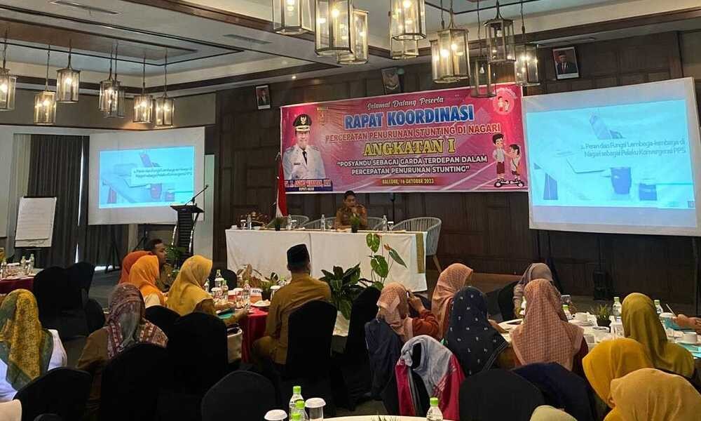 AGAM, CARAPANDANG.COM - Pemerintah Kabupaten Agam melalui Dinas Pemberdayaan Masyarakat dan Nagari menggelar Rapat koordinasi percepatan penurunan stunting Kabupaten Agam tahun 2023 di Balcone Hotel & Resort, Nagari Gaduik Kecamatan Tilatang Kamang,Senin (16/10).