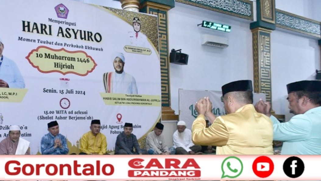 POHUWATO, CARAPANDANG - Pemerintah Daerah Kabupaten Pohuwato bersama Lembaga Adat menggelar perayaan Hari Asyura (10 Muharram) 1446 H yang berlangsung di Masjid Agung Baiturrahim, Senin, (15/07/2024).