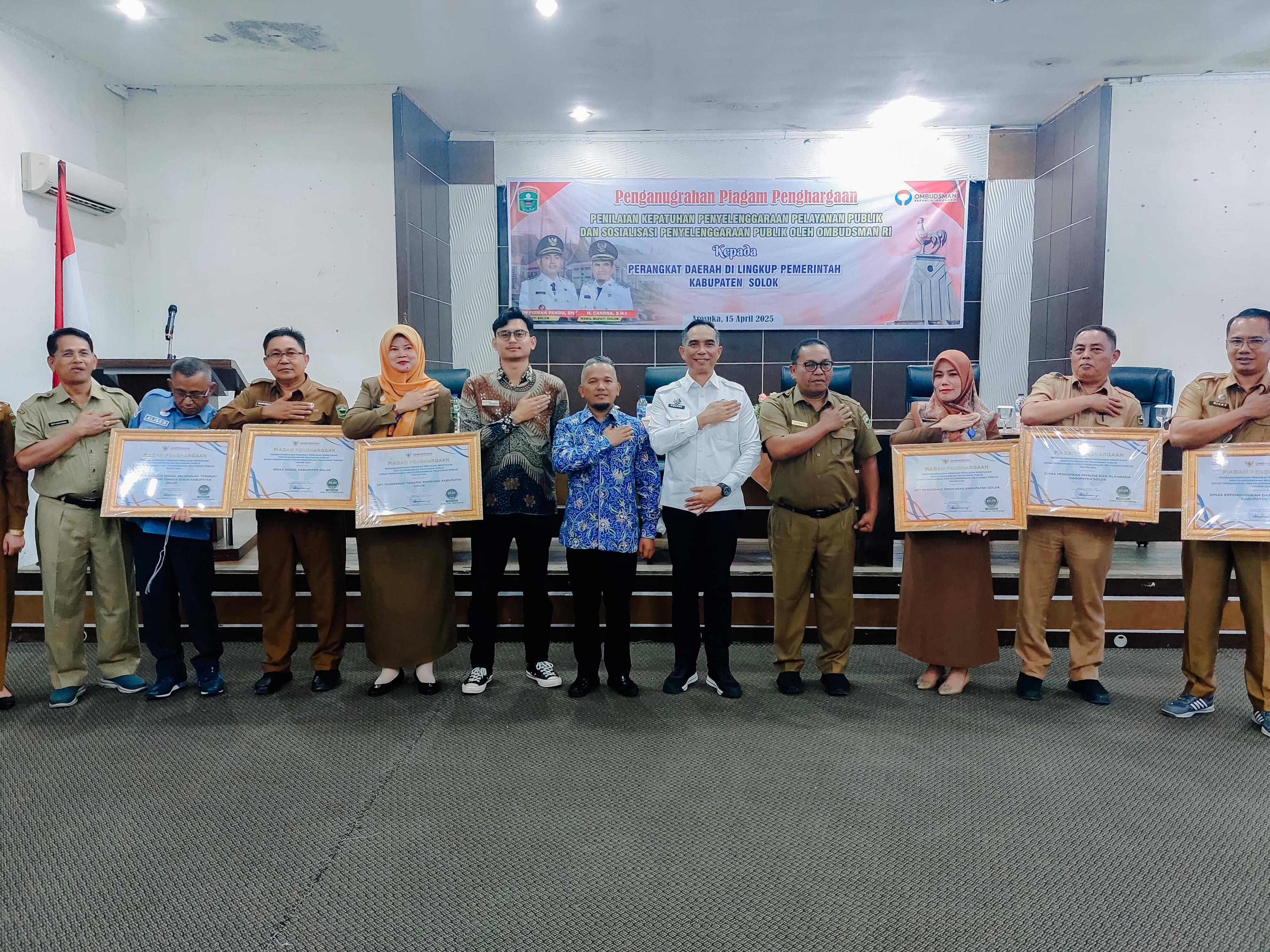 SOLOK, CARAPANDANG - Pemerintah Kabupaten Solok kembali menorehkan prestasi membanggakan dalam bidang pelayanan publik. Bertempat di Ruang Rapat Solinda, Selasa (15/4/2025), digelar kegiatan Sosialisasi Penyelenggaraan Pelayanan Publik sekaligus penyerahan piagam penghargaan kepada sejumlah unit layanan oleh Ombudsman RI Perwakilan Sumatera Barat.