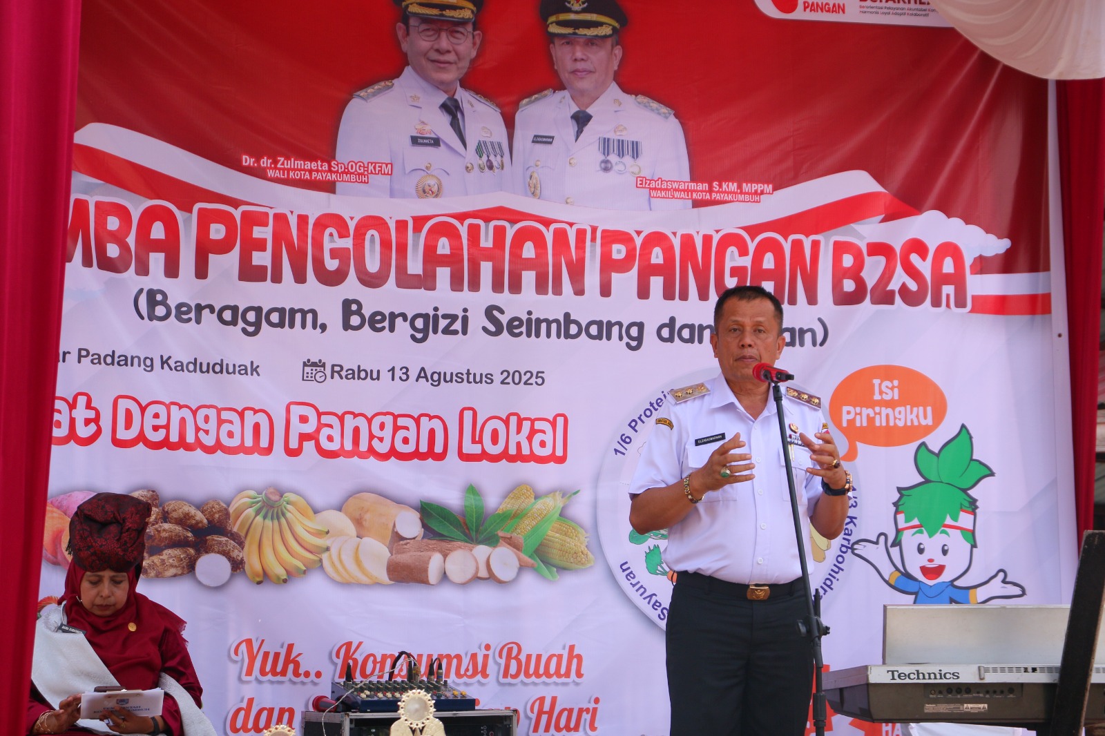 PAYAKUMBUH, CARAPANDANG - Pemerintah Kota Payakumbuh menggelar Lomba Pengelolaan Pangan Beragam, Bergizi, Seimbang, dan Aman (B2SA) serta Bazar Pasar Murah di Pasar Rakyat Padang Kaduduak, Rabu (13/8/2025). Kegiatan yang dibuka langsung oleh Wakil Wali Kota Payakumbuh, Elzadaswarman, ini menjadi langkah strategis untuk menekan inflasi, memperkuat ketahanan pangan, dan mengedukasi masyarakat tentang pola makan sehat.