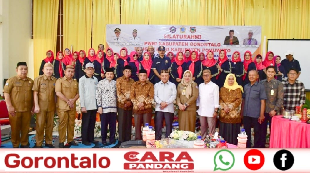 POHUWATO, CARAPANDANG - Kunjungan silaturahmi Persatuan Wredatama Republik Indonesia (PWRI) Kabupaten Gorontalo ke Kabupaten Pohuwato dirangkaikan dengan pengukuhan pengurus PWRI Kecamatan se-Kabupaten Pohuwato masa bakti 2025-2030 yang berlangsung di Gedung Panua dihadiri Bupati Pohuwato diwakili Asisten Perekonomian dan Pembangunan, Fitriani Lasantu, Ketua DPRD Pohuwato, Beni Nento, Selasa, (04/02/2025).