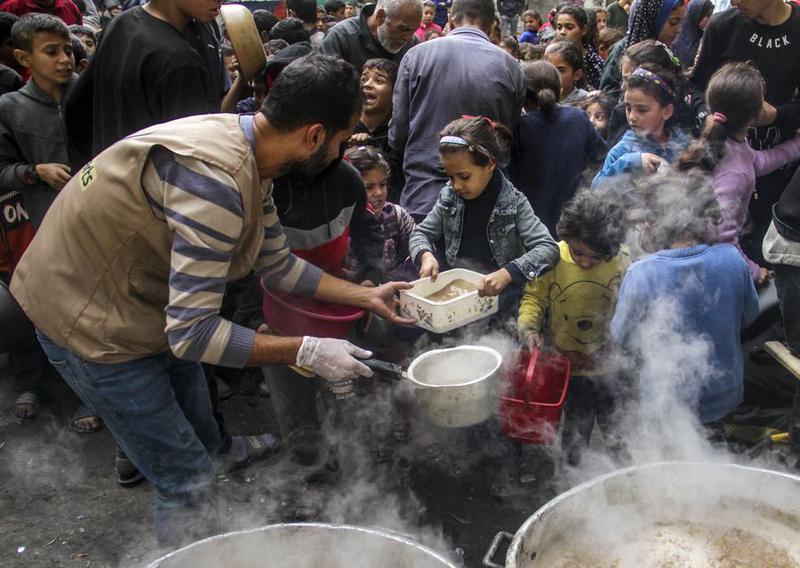 Pengungsi Palestina berusaha mendapatkan bantuan makanan dari sebuah dapur umum setempat di tengah pengepungan yang diberlakukan oleh tentara Israel dan kelangkaan bantuan di kamp Al-Shati, sebelah barat Gaza City, pada 7 Desember 2024. (Xinhua/Mahmoud Zaki)
