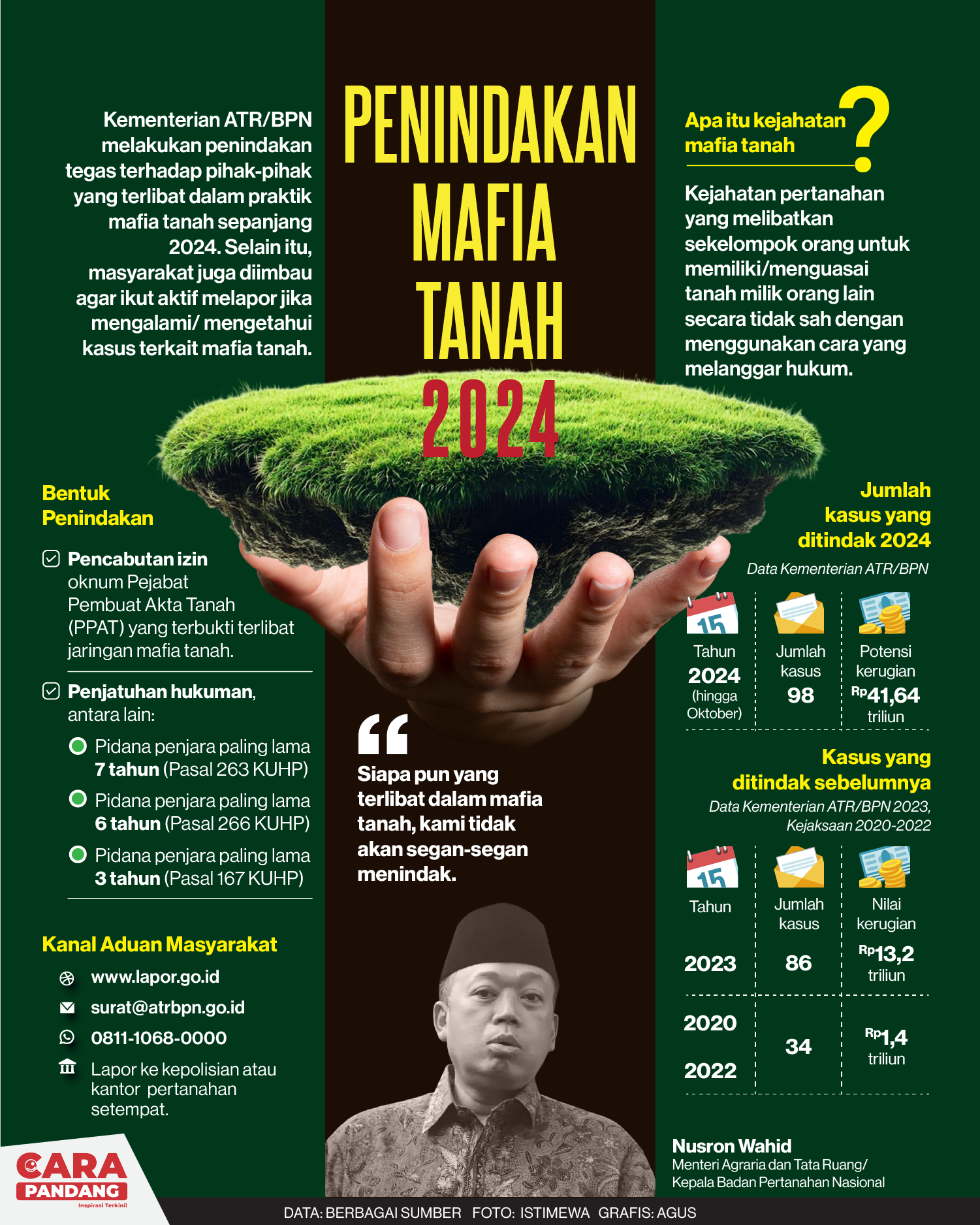 Beranda Infografis Penindakan Mafia Tanah 2024 Infografis Penindakan Mafia Tanah 2024 Penulis Edo Soeryadi - 18 Desember 2024 08:52 0 CARAPANDANG.COM - Mafia Tanah. Tags Infografik Berita Sebelumnya Pembangunan LRT Jakarta Fae 1B Capai 39,83 Persen Berita Berikutnya Indonesia Dalam Dilema Misi Perdamaian Dunia LEAVE A REPLY Cancel reply Comment: Please enter your comment! Name:* Please enter your name here Email:* You have entered an incorrect email address! Please enter your email address here Website: Save my name, email, and website in this browser for the next time I comment. Berita Teratas Kisah Ajaib Nabi Sulaiman dan Anak yang Berbakti kepada Orang Tua 8 Cara Merawat Kucing Kesayangan Agar Tubuhnya Selalu Sehat Minuman yang Mampu Redakan Batuk yang Menganggu Manfaat Ajaib Bawang Putih Bagi Kesehatan 8 Cara Menjaga Kesehatan Gigi dan Mulut yang Efektif Berita Terkait Berita Terkait Wajah Baru PP Tunas: Garda Terdepan Perlindungan Anak Indonesia Zoel Rachman - 31 Maret 2026 09:42 MBG 5 Hari Sepekan Masih Wacana Maliq - 30 Maret 2026 11:49 Presiden Ingin Semua Kendaraan Dikonversi ke Listrik Maliq - 30 Maret 2026 11:48 Kewaijiban PSE Terhadap Pengguna Anak Maliq - 30 Maret 2026 11:15