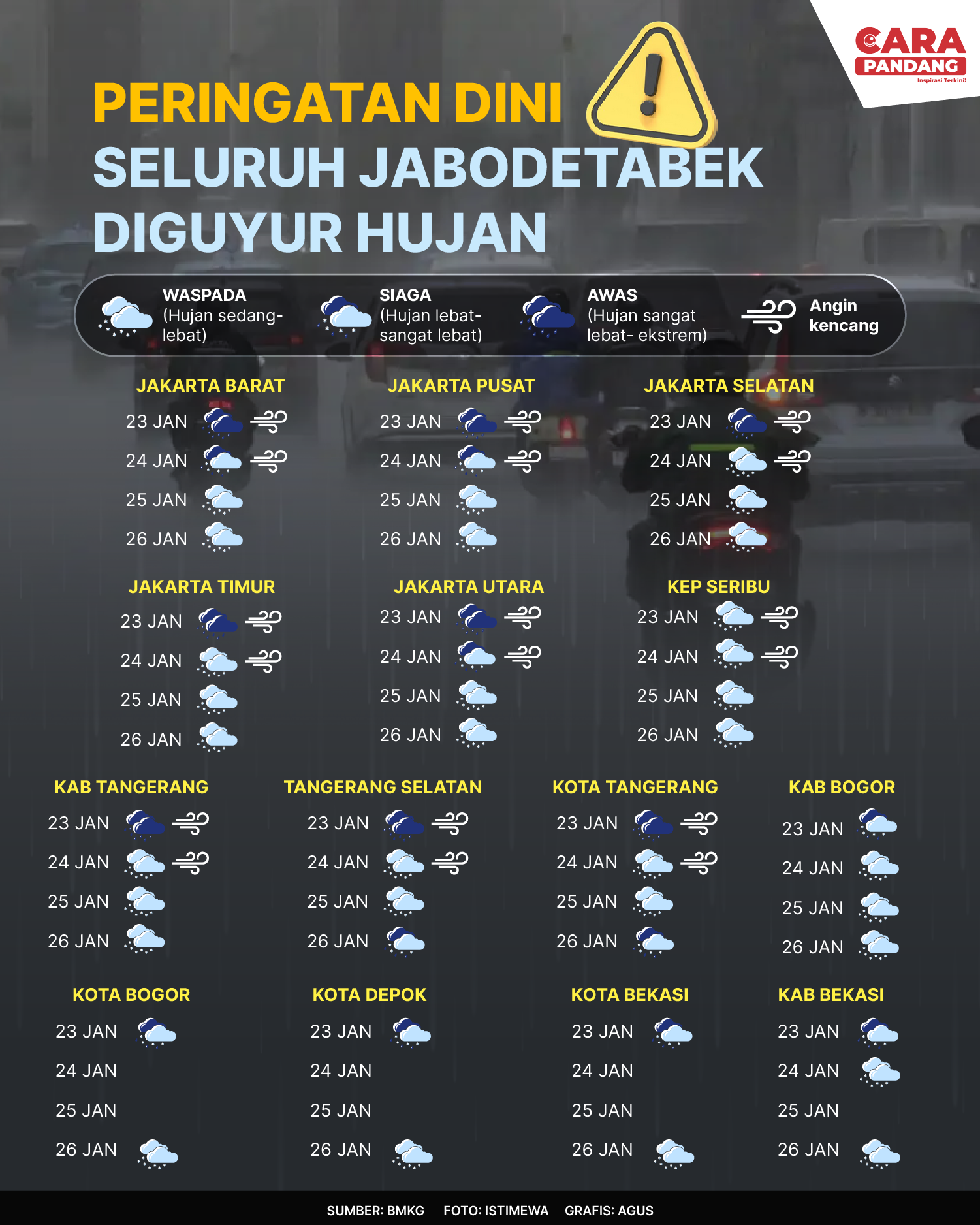 Beranda Infografis Peringatan! Seluruh Jabodetabek Diguyur Hujan! Infografis Peringatan! Seluruh Jabodetabek Diguyur Hujan! Penulis Amira Izzati - 24 Januari 2026 00:01 0 Peringatan! Seluruh Jabodetabek Diguyur Hujan! Tags Berita Sebelumnya DPR: Tidak Ada Pendidikan Berkualitas Tanpa Kesejahteraan Guru Berita Berikutnya Indonesia Dalam Dilema Misi Perdamaian Dunia LEAVE A REPLY Cancel reply Comment: Please enter your comment! Name:* Please enter your name here Email:* You have entered an incorrect email address! Please enter your email address here Website: Save my name, email, and website in this browser for the next time I comment. Berita Teratas Kisah Ajaib Nabi Sulaiman dan Anak yang Berbakti kepada Orang Tua 8 Cara Merawat Kucing Kesayangan Agar Tubuhnya Selalu Sehat Minuman yang Mampu Redakan Batuk yang Menganggu Manfaat Ajaib Bawang Putih Bagi Kesehatan 8 Cara Menjaga Kesehatan Gigi dan Mulut yang Efektif Berita Terkait Berita Terkait Wajah Baru PP Tunas: Garda Terdepan Perlindungan Anak Indonesia Zoel Rachman - 31 Maret 2026 09:42 MBG 5 Hari Sepekan Masih Wacana Maliq - 30 Maret 2026 11:49 Presiden Ingin Semua Kendaraan Dikonversi ke Listrik Maliq - 30 Maret 2026 11:48 Kewaijiban PSE Terhadap Pengguna Anak Maliq - 30 Maret 2026 11:15