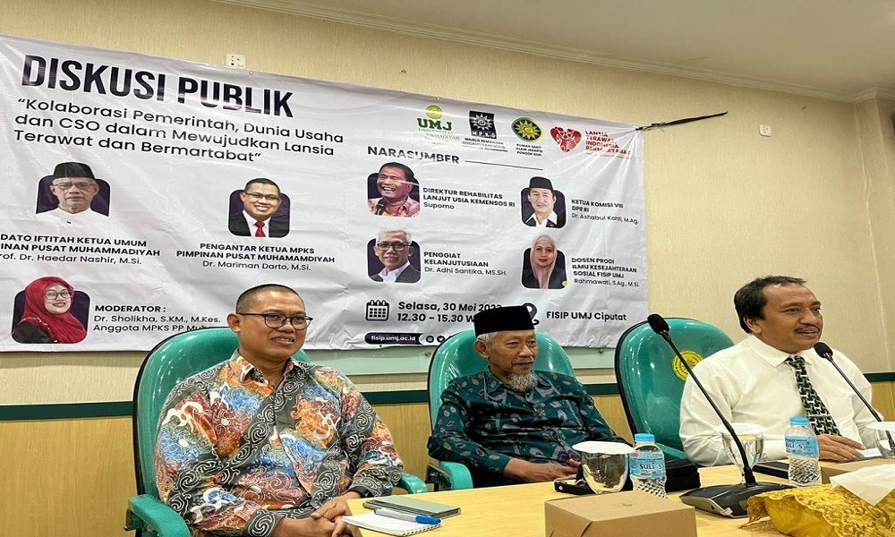 CARAPANDANG - Memperingati Hari Lanjut Usia Nasional tahun 2023, Majelis Pembinaan Kesejahteraan Sosial (MPKS) Pimpinan Pusat Muhammadiyah menggelar diskusi publik bertema "Kolaborasi Pemerintah, Dunia Usaha dan CSO dalam mewujudkan Lansia Terawat dan Bermartabat" pada Selasa (30/5) di Kampus FISIP UMJ.