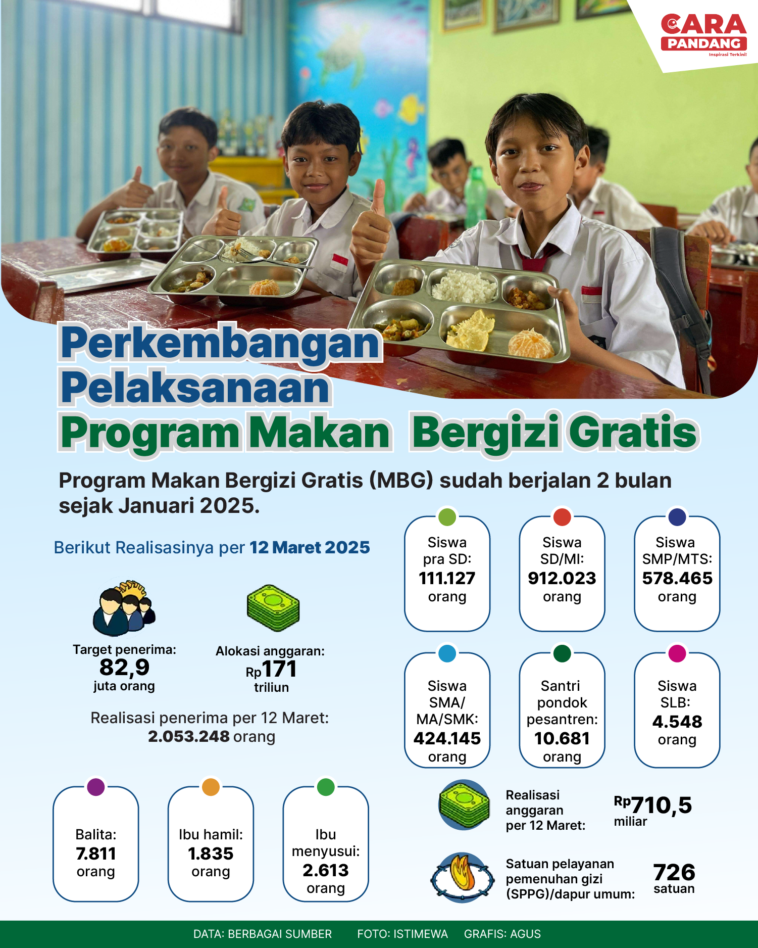 Beranda Infografis Perkembangan Pelaksanaan Program MBG Infografis Perkembangan Pelaksanaan Program MBG Perkembangan Pelaksanaan Program MBG. Penulis Edo Soeryadi - 03 April 2025 08:53 0 CARAPANDANG.COM - Perkembangan Pelaksanaan Program MBG. Tags MBG Siswa Program Target Berita Sebelumnya Arus Balik Lebaran 2025, Ini Diskon Tarif Tol 20 Persen Berita Berikutnya Indonesia Dalam Dilema Misi Perdamaian Dunia LEAVE A REPLY Cancel reply Comment: Please enter your comment! Name:* Please enter your name here Email:* You have entered an incorrect email address! Please enter your email address here Website: Save my name, email, and website in this browser for the next time I comment. Berita Teratas Kisah Ajaib Nabi Sulaiman dan Anak yang Berbakti kepada Orang Tua 8 Cara Merawat Kucing Kesayangan Agar Tubuhnya Selalu Sehat Minuman yang Mampu Redakan Batuk yang Menganggu Manfaat Ajaib Bawang Putih Bagi Kesehatan 8 Cara Menjaga Kesehatan Gigi dan Mulut yang Efektif Berita Terkait Berita Terkait Wajah Baru PP Tunas: Garda Terdepan Perlindungan Anak Indonesia Zoel Rachman - 31 Maret 2026 09:42 MBG 5 Hari Sepekan Masih Wacana Maliq - 30 Maret 2026 11:49 Presiden Ingin Semua Kendaraan Dikonversi ke Listrik Maliq - 30 Maret 2026 11:48 Kewaijiban PSE Terhadap Pengguna Anak Maliq - 30 Maret 2026 11:15