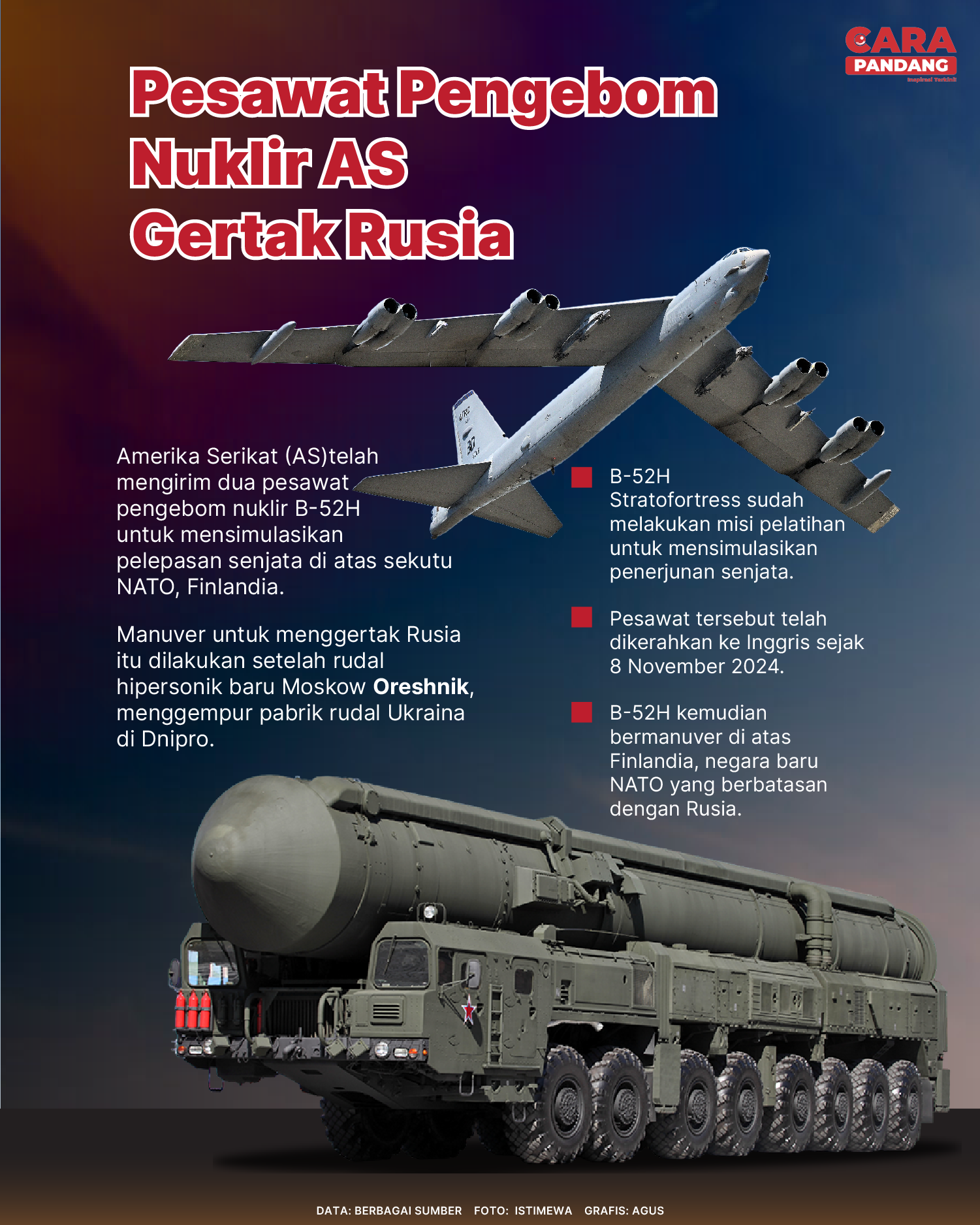 Amerika Serikat (AS) telah mengirim dua pesawat pengebom B-52H untuk mensimulasikan pelepasan senjata di atas sekutu NATO; Finlandia. Manuver untuk menggertak Rusia itu dilakukan setelah rudal hipersonik baru Moskow; Oreshnik, menggempur pabrik rudal Ukraina di Kota Dnipro.