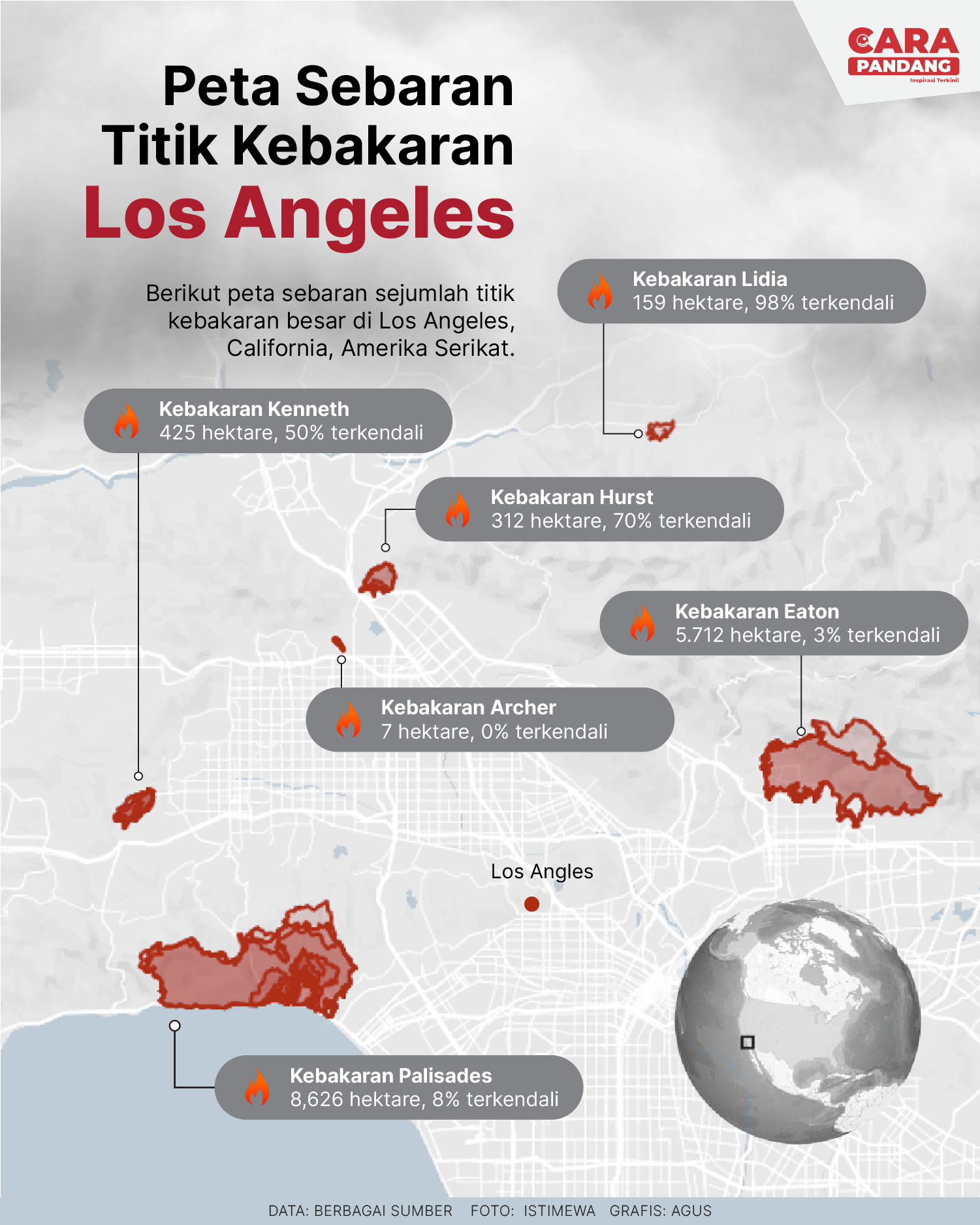 CARAPANDANG - Kebakaran hutan yang bergerak cepat melanda distrik elit Pacific Palisades yang merupakan kawasan metropolitan Los Angeles, California pada Selasa (7/1) pagi waktu setempat.