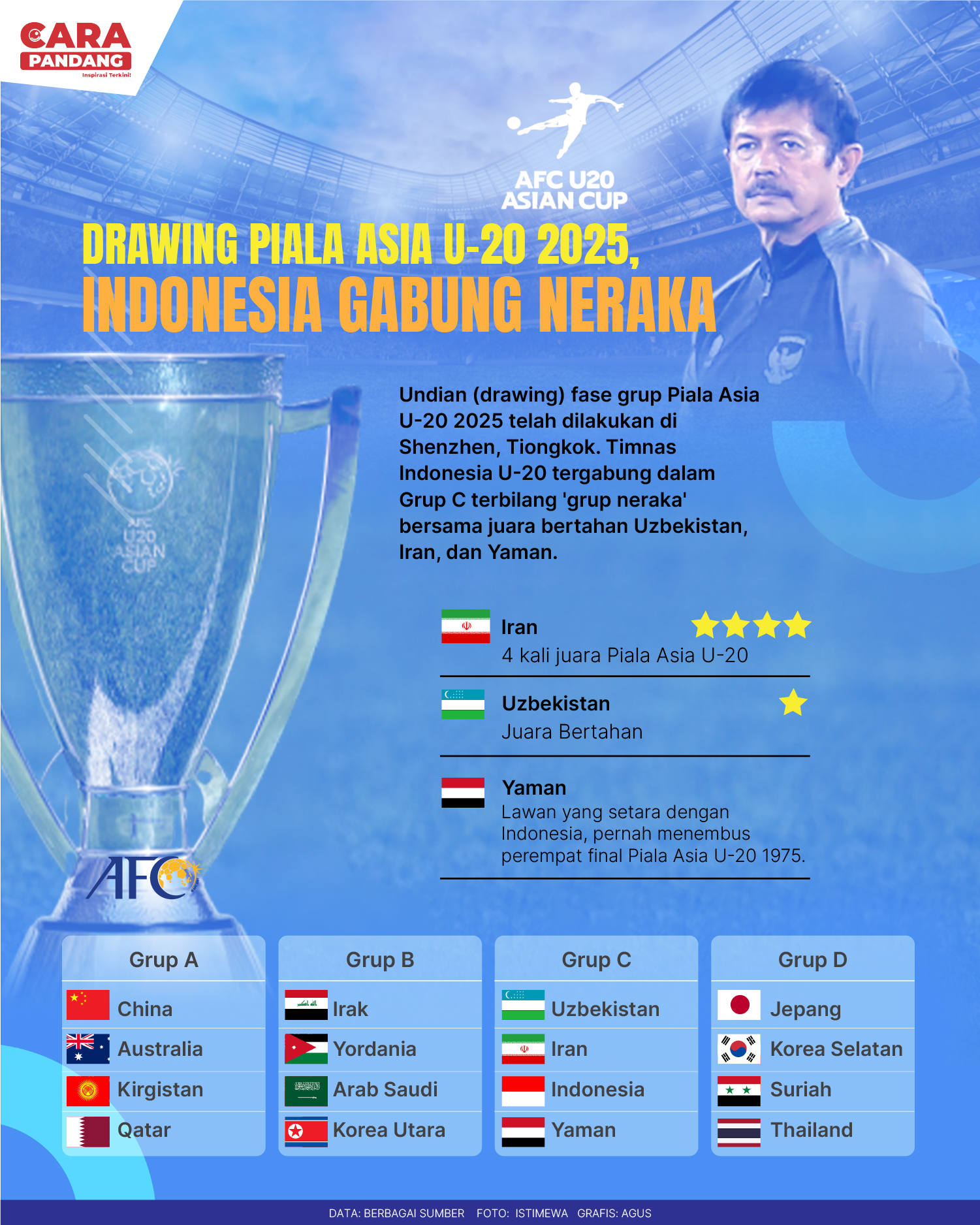 Undian (drawing) fase grup Piala Asia U-20 2025 telah dilakukan di Shenzhen, Tiongkok, Kamis (7/11/2024) siang WIB. Timnas Indonesia U-20 tergabung dalam Grup C bersama juara bertahan Uzbekistan, Iran, dan Yaman.