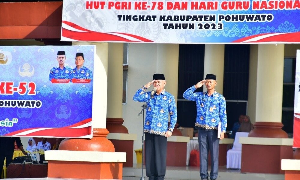 POHUWATO, CARAPANDANG.COM - Bupati Pohuwato Saipul A Mbuinga pimpin upacara peringatan HUT Korpri ke-52, Hari Guru Nasional dan HUT PGRI ke-78 tingkat Kabupaten Pohuwato tahun 2023, Rabu (29/11/2023), di halaman kantor sementara Bupati Pohuwato.
