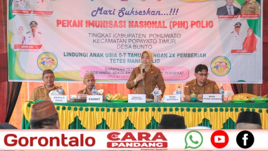 POHUWATO, CARAPANDANG -Wakil Bupati Pohuwato, Suharsi Igirisa, menghadiri Pencanangan Pekan Imunisasi Nasional (PIN) Polio tingkat Kabupaten Pohuwato yang digelar di Desa Bunto, Kecamatan Popayato Timur, pada Selasa (23/07/2024).