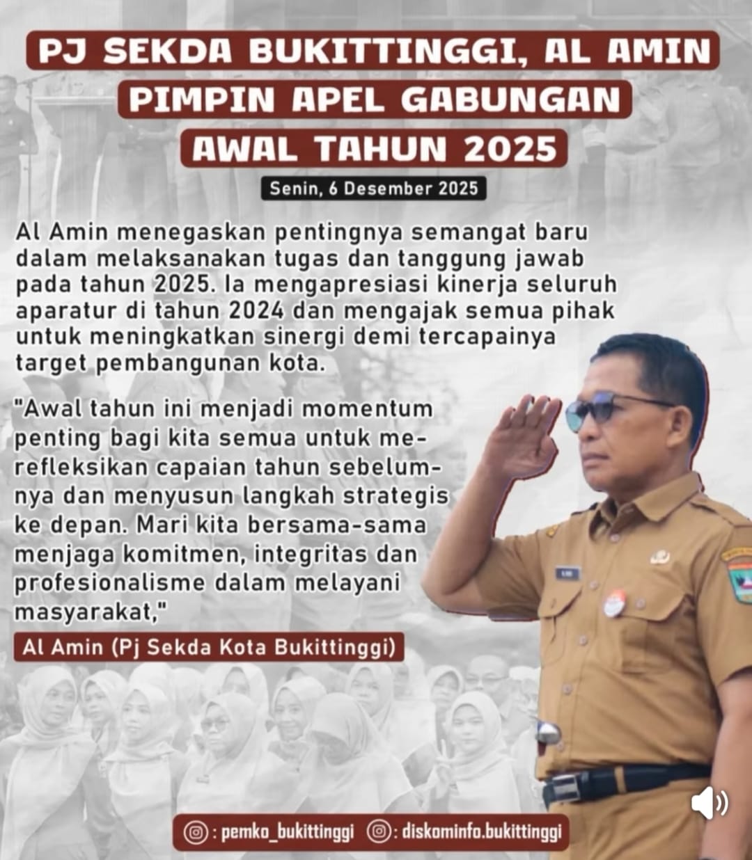 Pj Sekretaris Daerah (Sekda) Bukittinggi, Al Amin, memimpin apel gabungan awal tahun 2025 yang berlangsung di halaman Balaikota Bukittinggi, Senin, 6 Desember 2025.
