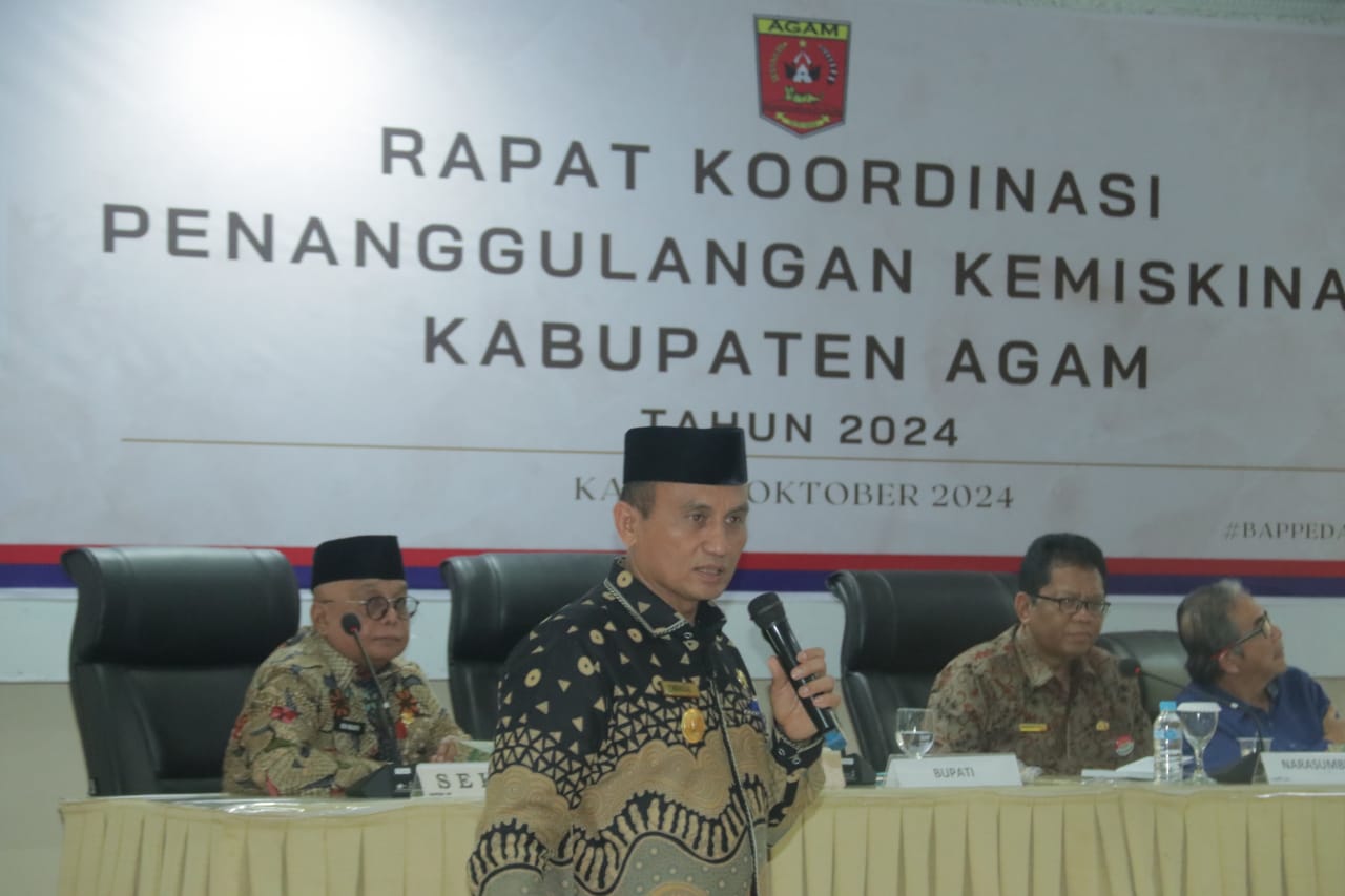 AGAM, CARAPANDANG - Pemerintah Kabupaten Agam melalui Tim Koordinasi Penanggulangan Kemiskinan (TKPK) menggelar Rapat Koordinasi Penanggulangan Kemiskinan di Aula Bappeda, Lubuk Basung, Kamis (3/10). Kegiatan ini dilaksanakan sesuai dengan amanat Peraturan Menteri Dalam Negeri Nomor 53 Tahun 2020 tentang tata kerja, penyelarasan kerja, serta pembinaan kelembagaan dan sumber daya manusia.