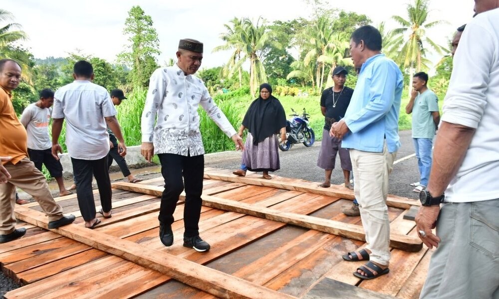 Diakui dengan kondisi yang ada saat ini jelas akan membahayakan pengguna jalan, sehingga dilakukan pembuatan jembatan darurat dengan mengalasnya menggunakan papan tebal. “Plat dari jembatan ini aman, hanya pasangan batu atau abutmennya saja yang longsor. Ini harus cepat diantisipasi agar akses kenderaan dan orang ke bagian atas Desa Puncak Jaya tetap berjalan normal”, jelas Bupati Saipul.