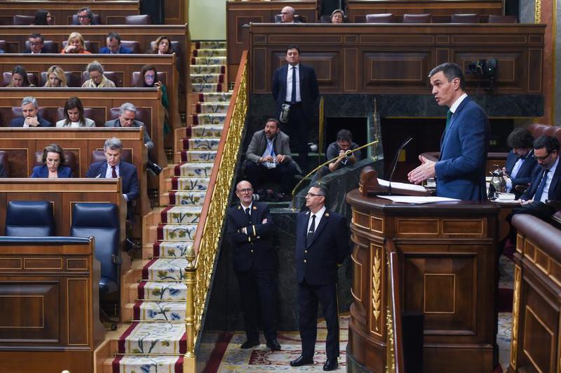 Perdana Menteri Spanyol Pedro Sanchez berbicara di hadapan Kongres Spanyol di Madrid, Spanyol, pada 26 Maret 2025. (Xinhua/Gustavo Valiente)