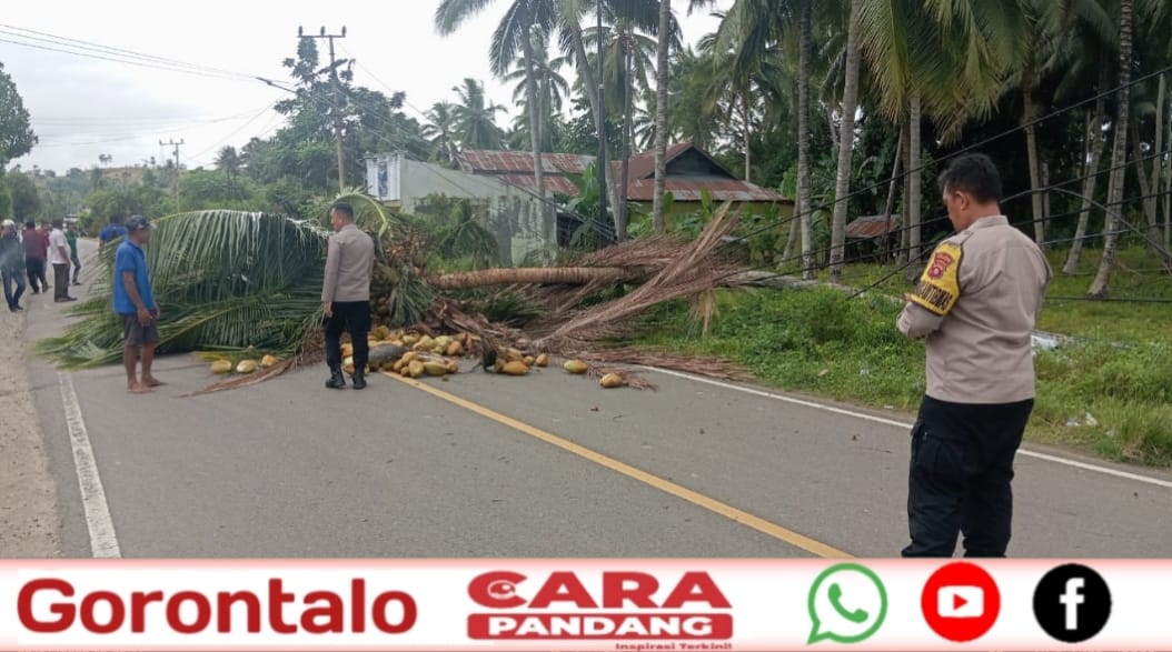 POHUWATO, CARAPANDANG - Sebuah pohon kelapa tumbang terjadi di Desa Iloheluma Kecamatan Patilanggio Kabupaten Pohuwato Provinsi Gorontalo yang menimpa kabel SR milik PLN sehingga mengakibatkannya kabel putus dan badan jalan tertutup.