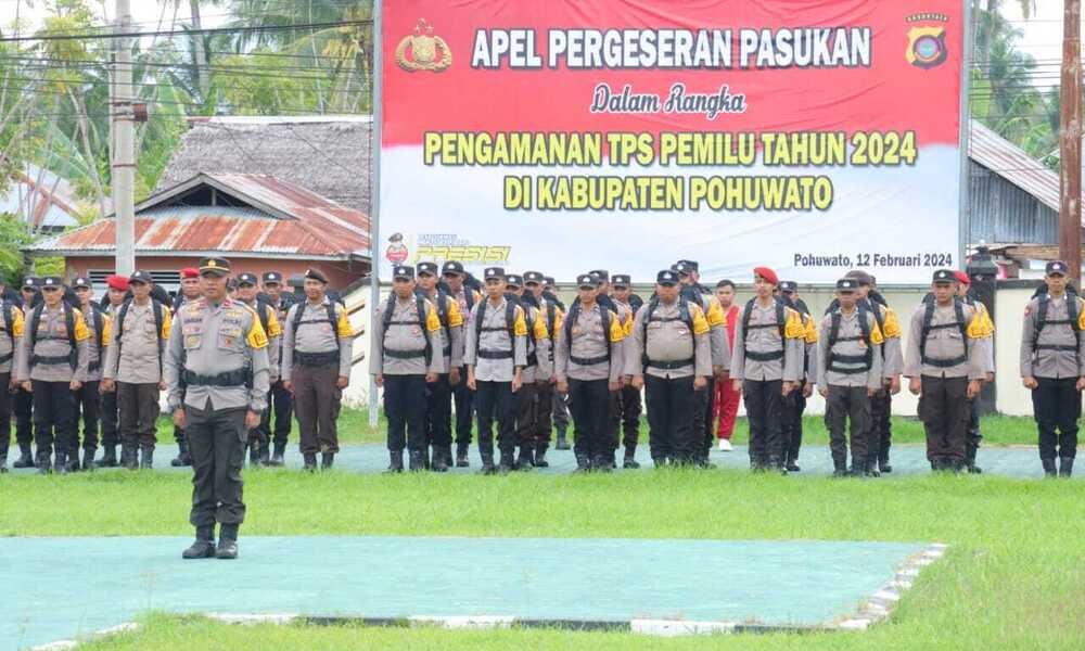 POHUWATO, CARAPANDANG.COM - Kepolisian Resort (Polres) Pohuwato menggelar Apel Pergeseran Pasukan yang bertempat di Lapangan Mapolres Pohuwato dalam rangka pelaksanaan pergeseran pasukan untuk Pengamanan Tempat Pemungutan Suara (TPS) di wilayah Kabupaten Pohuwato, Senin (12/02/2024).