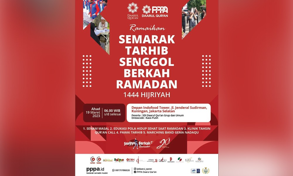 CARAPANDANG - Laznas PPPA Daarul Qur'an akan menggelar tarhib Ramadan di depan Indofood Tower, Kuningan, Jakarta Selatan pada Ahad, 19 Maret 2023 mendatang mulai pukul 06.00 WIB. Acara ini digelar dalam rangka menyambut bulan suci Ramadan 1444 Hijriyah.
