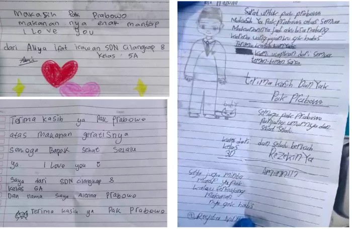 "Surat untuk Pak Prabowo. Makasih ya, Pak Prabowo atas semua makanannya. Jadi, aku bisa nabung karena uang jajanku enggak habis. Terima kasih banyak kami ucapkan dari semua teman-teman saya," tulis Regita dalan surat tersebut.