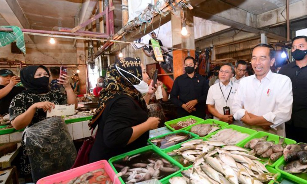 CARAPANDANG - Presiden Joko Widodo (Jokowi) meninjau aktivitas perdagangan yang berlangsung di Pasar Rawamangun, Jakarta Timur untuk mengecek harga sejumlah bahan kebutuhan pokok menjelang Hari Raya Idul Fitri, Rabu. Harga komoditas pangan yang pertama dicek oleh Presiden Jokowi yaitu telur.