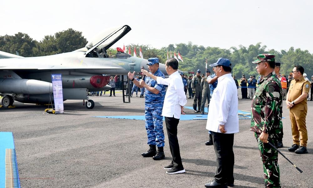 CARAPANDANG - Presiden Joko Widodo mengawali kunjungan kerjanya di Provinsi Jawa Timur pada Jumat, 8 Maret 2024 dengan meninjau alat utama sistem persenjataan (alutsista) TNI di Pangkalan TNI AU Iswahjudi, Kabupaten Magetan. Presiden bersama Menteri Pertahanan Prabowo Subianto, Panglima TNI Jenderal Agus Subiyanto, dan Kepala Staf TNI Angkatan Udara (KSAU) Marsekal Fadjar Prasetyo melihat kesiapan tiga pesawat tempur TNI AU, yakni dua pesawat F-16 dan satu pesawat T-50.
