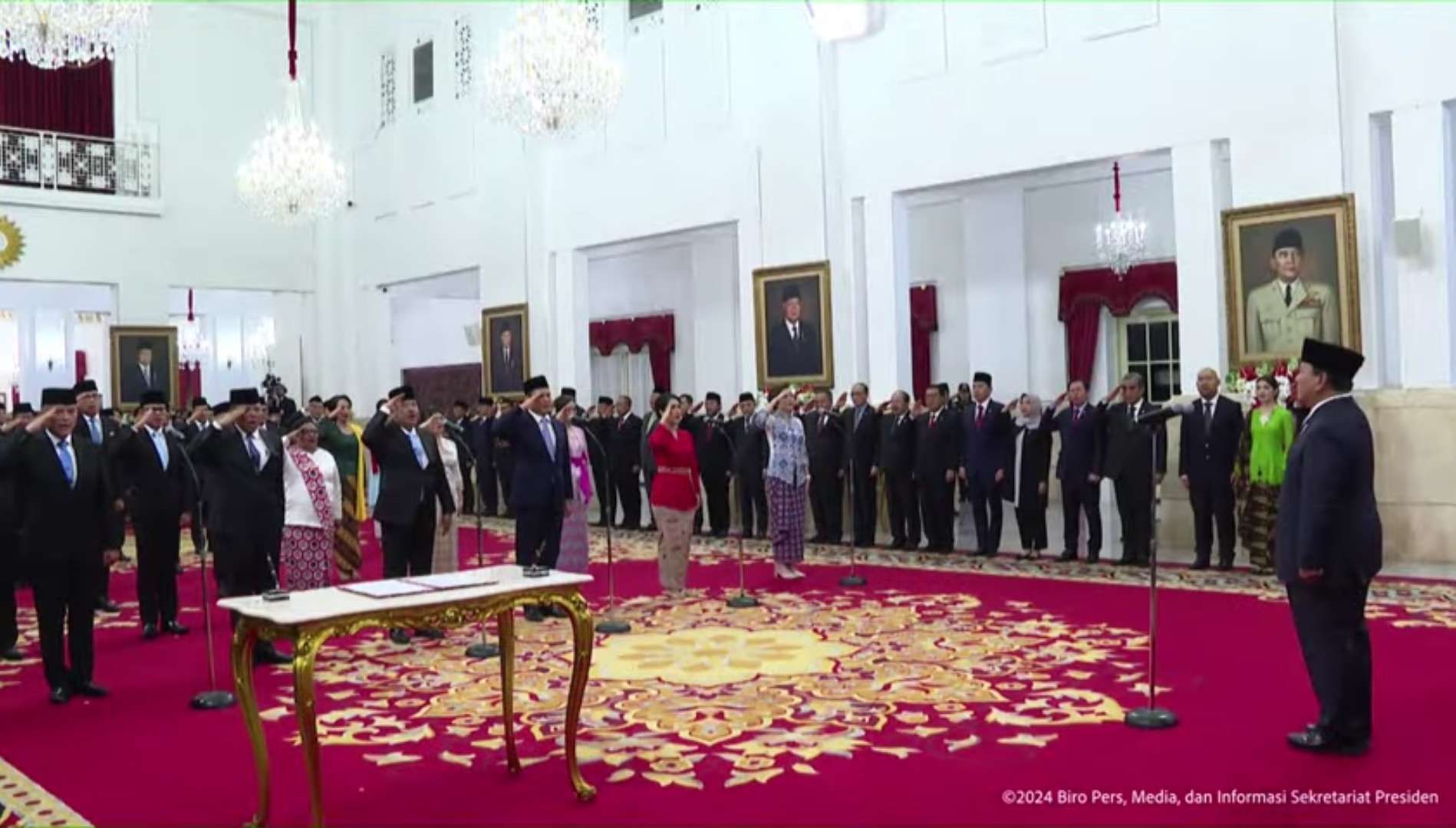 CARAPANDANG - Presiden Prabowo Subianto didampingi Wakil Presiden Gibran Rakabuming Raka melantik jajaran wakil menteri Kabinet Merah Putih. Pelantikan dilakukan di Istana Negara, Jakarta, Senin (21/10/2024).