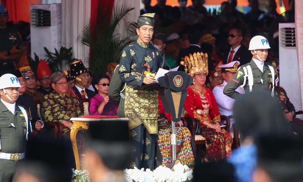 Presiden yang bertindak sebagai Inspektur Upacara terlihat mengenakan pakaian adat Kesultanan Deli berwarna hitam dan nuansa emas dilengkapi dengan keris dan penutup kepala.