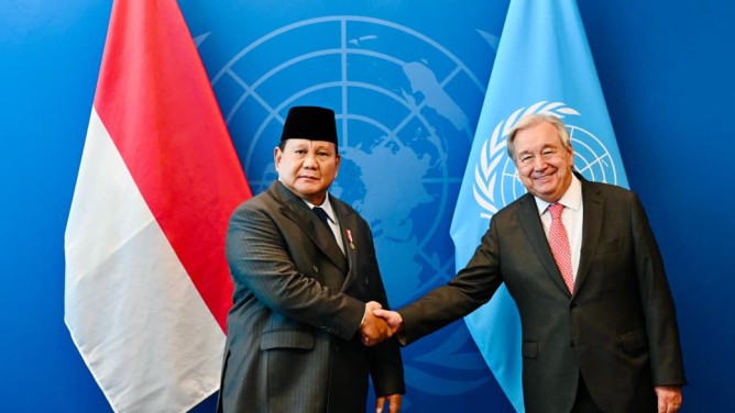 CARAPANDANG - Presiden Republik Indonesia, Prabowo Subianto melakukan pertemuan bilateral dengan Sekretaris Jenderal Perserikatan Bangsa-Bangsa (PBB), António Guterres, di lantai 27 Gedung Sekretariat PBB, New York, Amerika Serikat, pada Senin (22/09/2025). Setibanya di lokasi pertemuan, Presiden Prabowo disambut langsung oleh Sekjen PBB Guterres. Setelahnya kedua pemimpin melakukan sesi foto bersama.