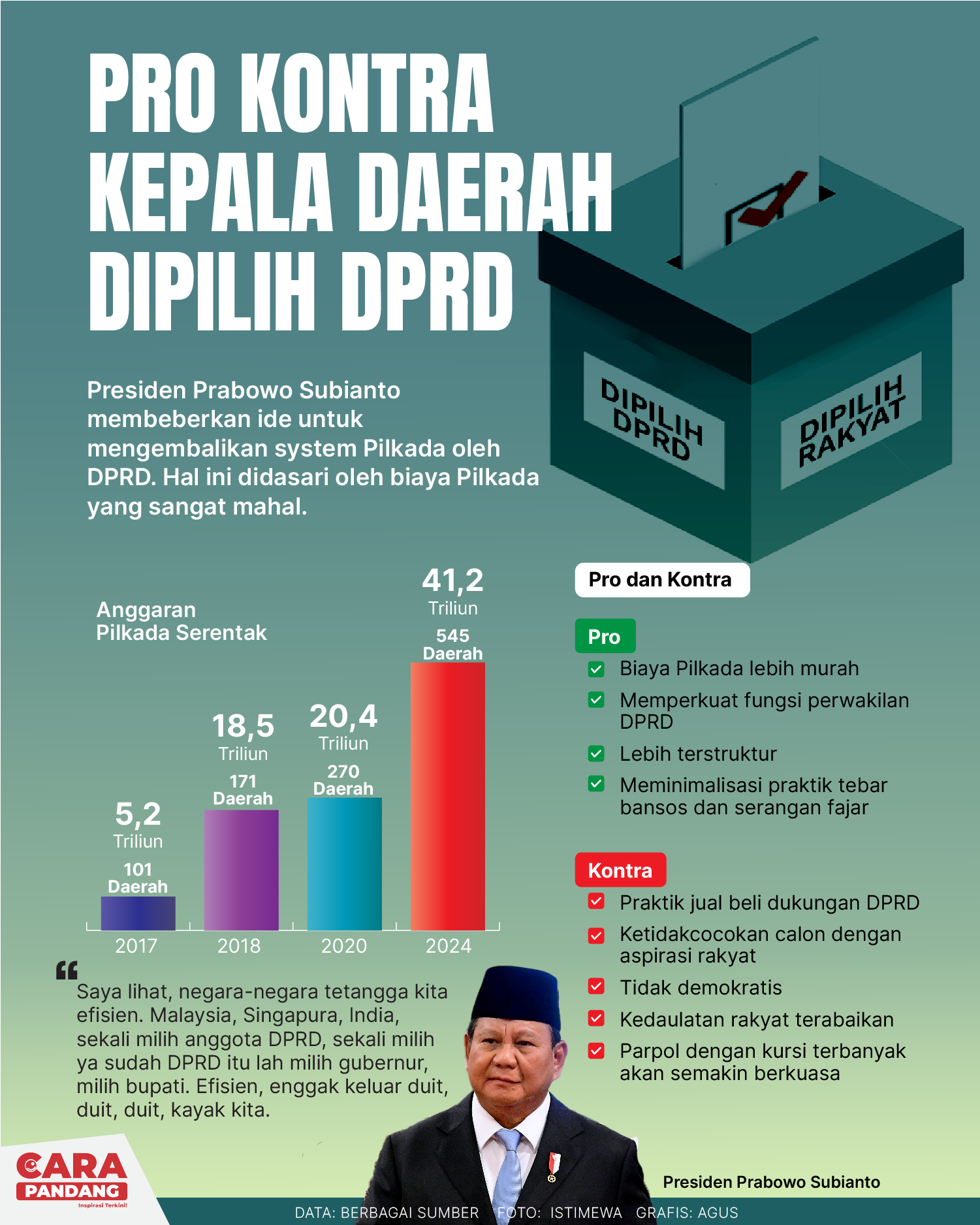 Beranda Infografis Pro Kontra Kepala Daerah dipilih DPRD Infografis Pro Kontra Kepala Daerah dipilih DPRD Penulis Edo Soeryadi - 23 Desember 2024 23:47 0 CARAPANDANG - Presiden Prabowo Subianto membeberkan ide untuk mengembalikan sistem pilkada ke DPRD. Tags Berita Sebelumnya Wakil Bupati Pohuwato Beri Ucapan Selamat untuk Muhammad Rizky Alhasni atas Gelar Magister Hukum Berita Berikutnya Indonesia Dalam Dilema Misi Perdamaian Dunia LEAVE A REPLY Cancel reply Comment: Please enter your comment! Name:* Please enter your name here Email:* You have entered an incorrect email address! Please enter your email address here Website: Save my name, email, and website in this browser for the next time I comment. Berita Teratas Kisah Ajaib Nabi Sulaiman dan Anak yang Berbakti kepada Orang Tua 8 Cara Merawat Kucing Kesayangan Agar Tubuhnya Selalu Sehat Minuman yang Mampu Redakan Batuk yang Menganggu Manfaat Ajaib Bawang Putih Bagi Kesehatan 8 Cara Menjaga Kesehatan Gigi dan Mulut yang Efektif Berita Terkait Berita Terkait Wajah Baru PP Tunas: Garda Terdepan Perlindungan Anak Indonesia Zoel Rachman - 31 Maret 2026 09:42 MBG 5 Hari Sepekan Masih Wacana Maliq - 30 Maret 2026 11:49 Presiden Ingin Semua Kendaraan Dikonversi ke Listrik Maliq - 30 Maret 2026 11:48 Kewaijiban PSE Terhadap Pengguna Anak Maliq - 30 Maret 2026 11:15