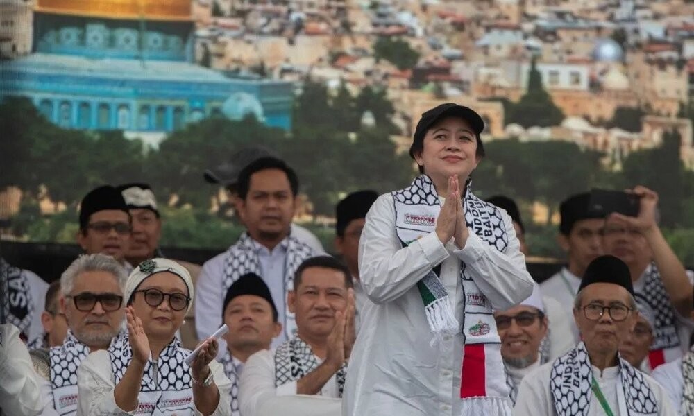 Puan datang dengan menggunakan baju putih dan memakai syal bergambar bendera Palestina mengatakan bahwa dirinya hadir dalam aksi tersebut atas undangan penggagas Aksi Rakyat Bela Palestina Din Syamsudin.