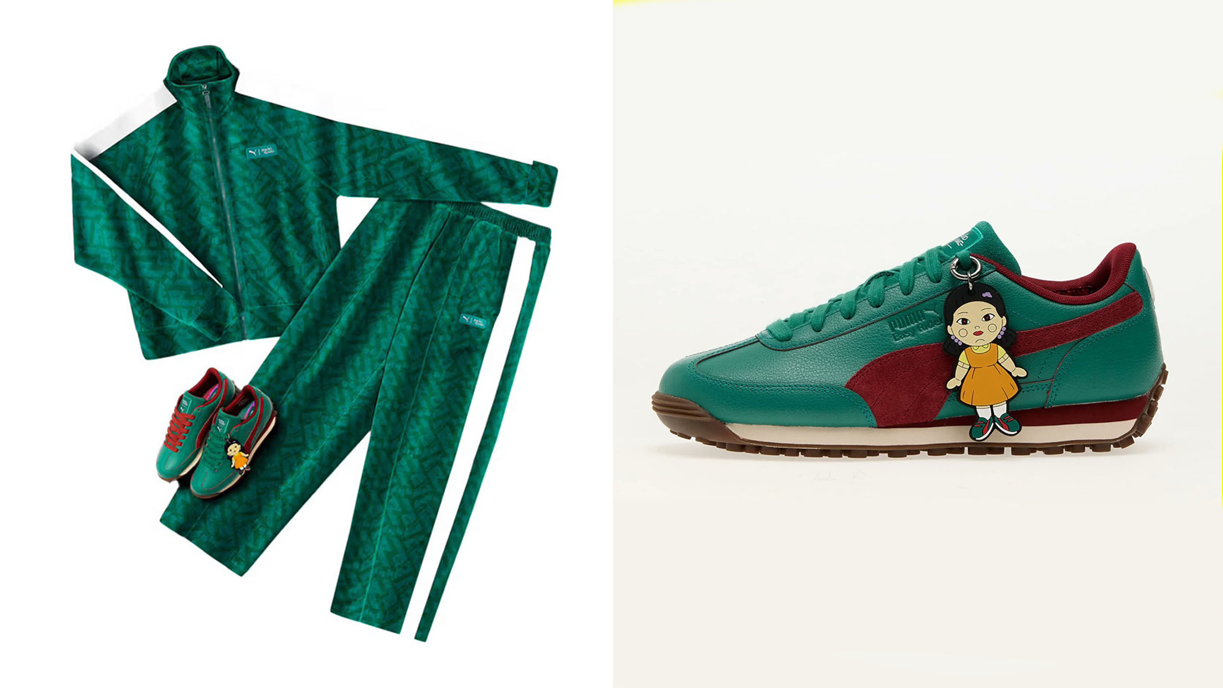 Jaket dan celana olahraga T7 yang ikonis ini dikreasikan ulang dengan desain yang terinspirasi dari stair room dalam Squid Game, dengan logo PUMA yang tersembunyi. Konsep desain tersebut merujuk pada seragam berwarna teal green yang dikenakan peserta dalam kompetisi rahasia dan mematikan itu.