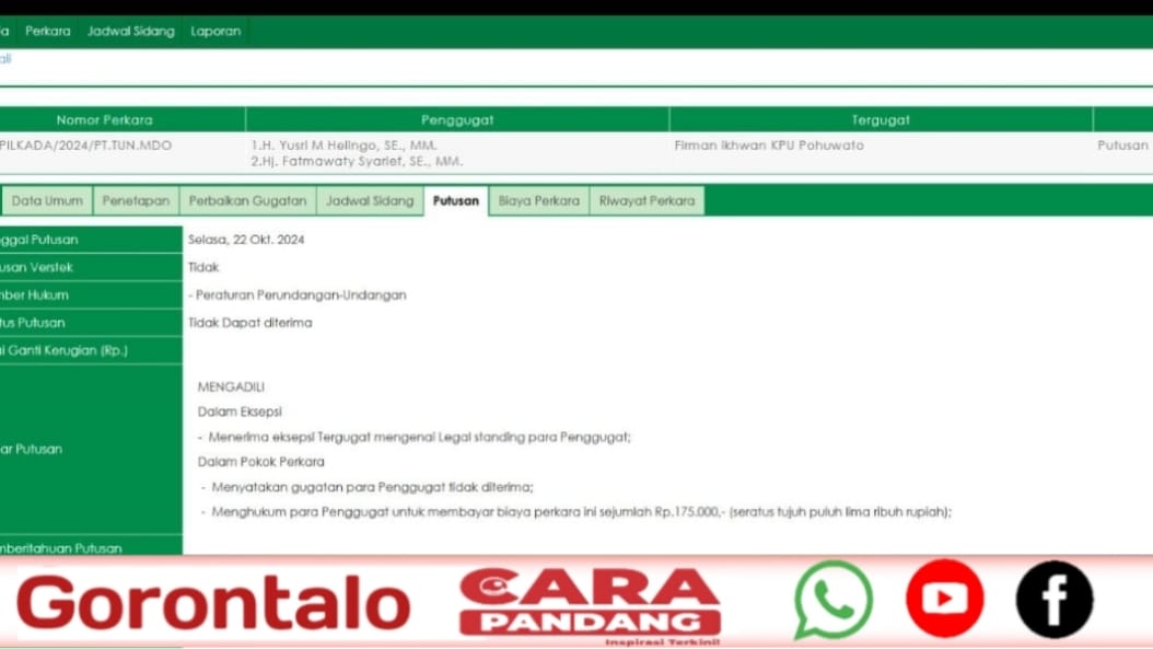 POHUWATO, CARAPANDANG - Melansir dari laman resmi Pengadilan Tata Usaha Negara (PTUN) Manado telah memutuskan untuk tidak dapat menerima gugatan yang diajukan oleh pasangan calon (Paslon) nomor urut 1, Yusrli Helingo dan Fatmawati Syarief, terkait dugaan pelanggaran mutasi.