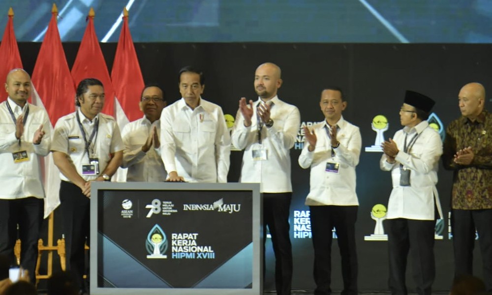 CARAPANDANG - Presiden RI Joko Widodo membuka Rapat Kerja Nasional (Rakernas) Badan Pengurus Pusat Himpunan Pengusaha Muda Indonesia (HIPMI) Ke-XVIII di Nusantara Hall, ICE-BSD, Tangerang, Kamis (31/8) pagi.