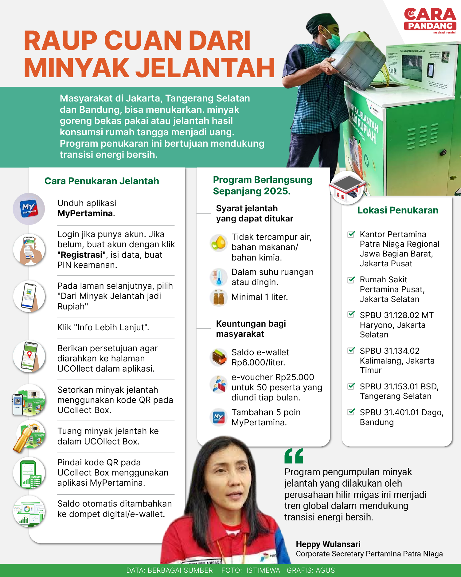 CARAPANDANG - Masyarakat terutama di Jakarta, Tangerang Selatan dan Bandung, bisa menukarkan minyak goreng bekas pakai atau jelantah hasil konsumsi rumah tangga menjadi uang. Program penukaran ini bertujuan mendukung transisi energi bersih.