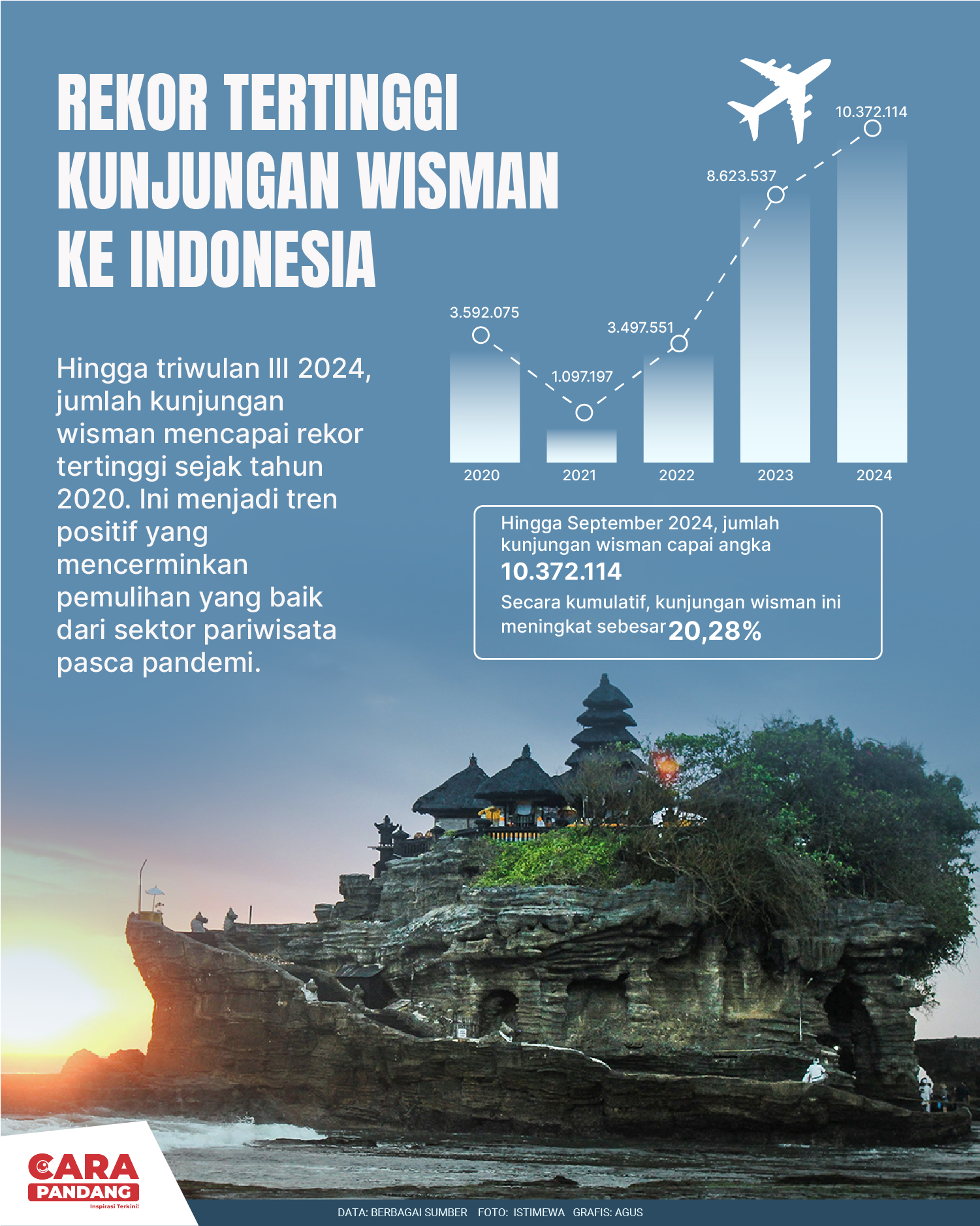 CARAPANDANG.COM - Hingga teriwulan III 2024, jumlah kunjungan wisman mencapai rekor tertinggi sejak tahun 2020. Ini menjadi tren positif yang mencerminkan pemulihan yang baik dari sektor pariwisata pasca pandemi.
