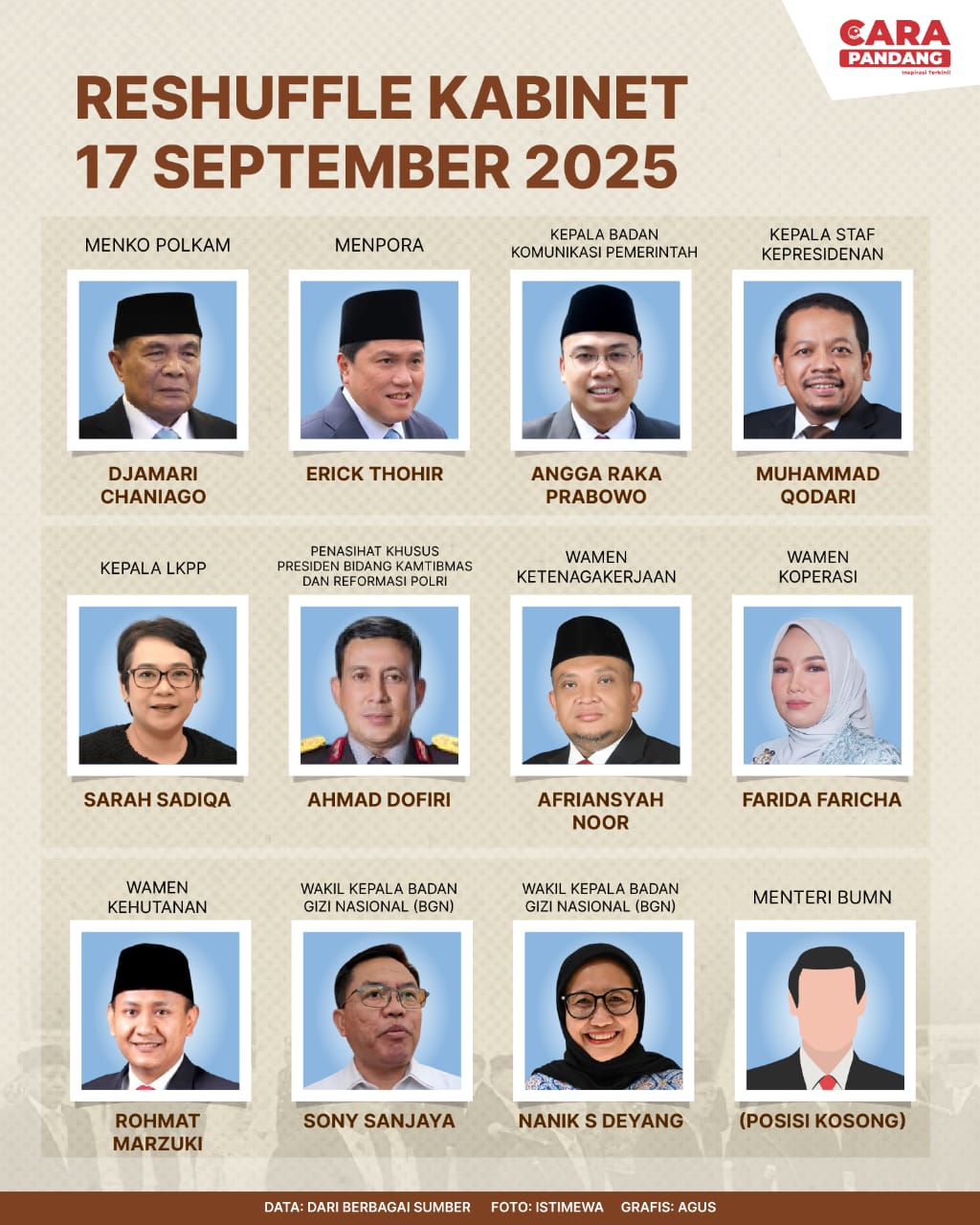 Beranda Infografis Reshuffle Kabinet 17 September 2025 Infografis Reshuffle Kabinet 17 September 2025 Reshuffle Kabinet 17 September 2025. Penulis Edo Soeryadi - 18 September 2025 18:17 0 CARAPANDANG.COM - Reshuffle Kabinet 17 September 2025. Tags Infografik Reshuffle Kabinet 2025 Berita Sebelumnya Dinas Keamanan Rusia Gagalkan Upaya Pembunuhan di St. Petersburg Berita Berikutnya Indonesia Dalam Dilema Misi Perdamaian Dunia LEAVE A REPLY Cancel reply Comment: Please enter your comment! Name:* Please enter your name here Email:* You have entered an incorrect email address! Please enter your email address here Website: Save my name, email, and website in this browser for the next time I comment. Berita Teratas Kisah Ajaib Nabi Sulaiman dan Anak yang Berbakti kepada Orang Tua 8 Cara Merawat Kucing Kesayangan Agar Tubuhnya Selalu Sehat Minuman yang Mampu Redakan Batuk yang Menganggu Manfaat Ajaib Bawang Putih Bagi Kesehatan 8 Cara Menjaga Kesehatan Gigi dan Mulut yang Efektif Berita Terkait Berita Terkait Wajah Baru PP Tunas: Garda Terdepan Perlindungan Anak Indonesia Zoel Rachman - 31 Maret 2026 09:42 MBG 5 Hari Sepekan Masih Wacana Maliq - 30 Maret 2026 11:49 Presiden Ingin Semua Kendaraan Dikonversi ke Listrik Maliq - 30 Maret 2026 11:48 Kewaijiban PSE Terhadap Pengguna Anak Maliq - 30 Maret 2026 11:15