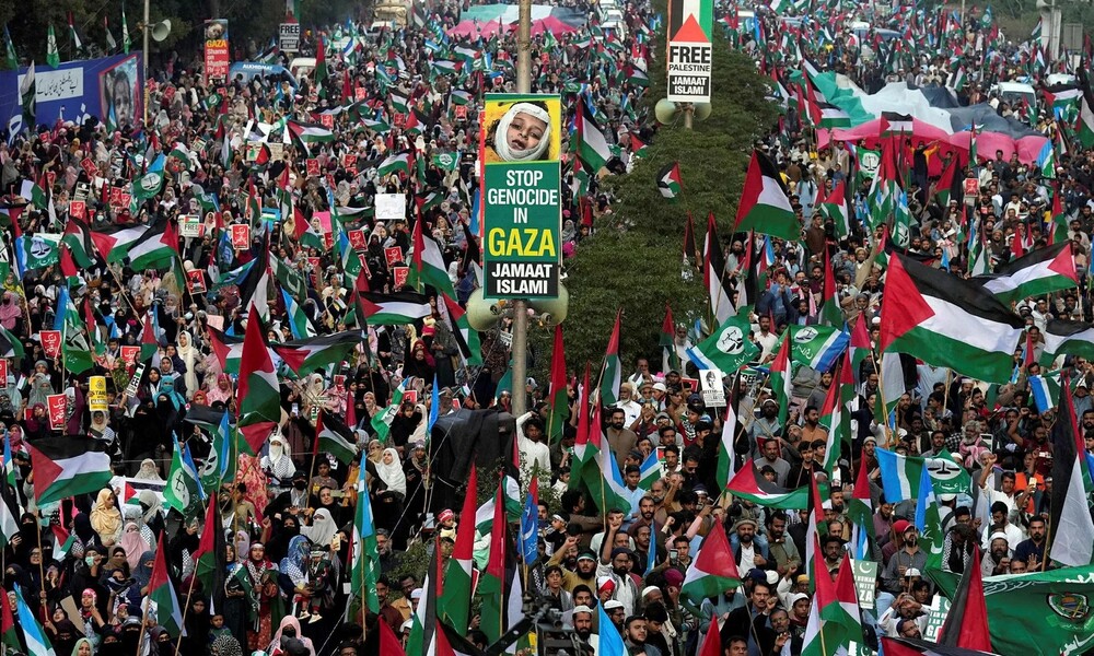 Ribuan orang meneriakkan "Labbaik ya Aqsa" (Aqsa kami di sini) dan "Labbaik ya Gaza"(Gaza kami di sini) secara serempak sembari mengibarkan bendera Palestina dan Pakistan.