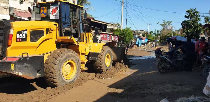 Foto yang diabadikan pada 2 Desember 2025 ini menunjukkan ekskavator dari Sany Indonesia sedang membersihkan lumpur dan kayu yang menghalangi jalan pascabanjir di Kabupaten Pidie Jaya, Provinsi Aceh. (Xinhua)
