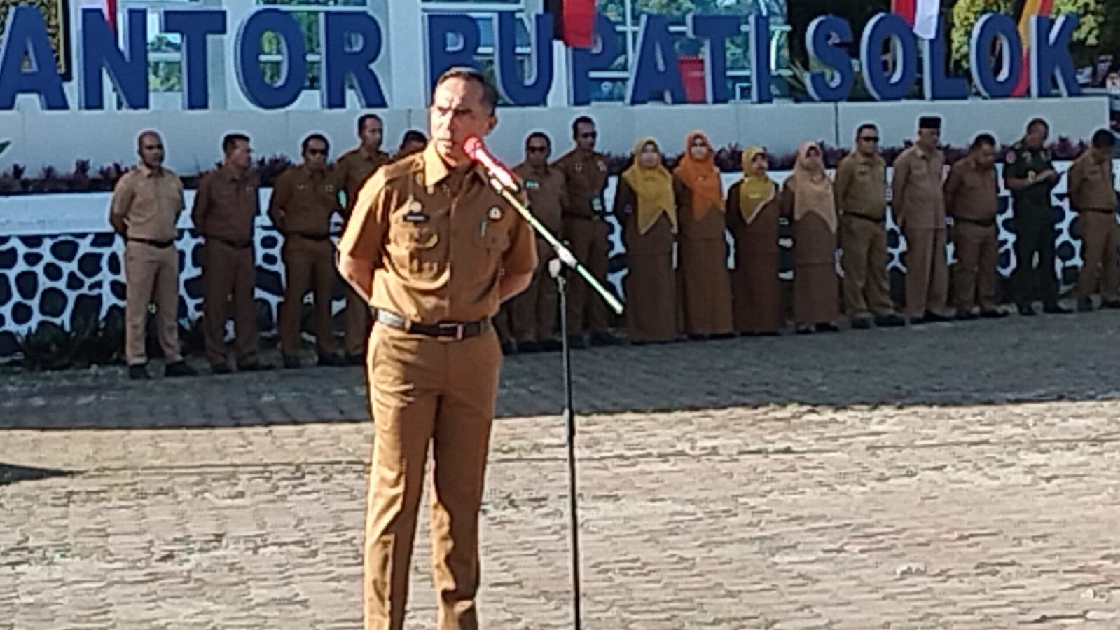 "Sebagai pengambil apel pagi ini, kami mengimbau kepada seluruh jajaran ASN di manapun bertugas dalam lingkup Pemerintah Kabupaten Solok, mari kita laksanakan tugas dengan sebaik-baiknya, secara profesional, ikuti aturan dan ketentuan yang berlaku," tegas Medison.