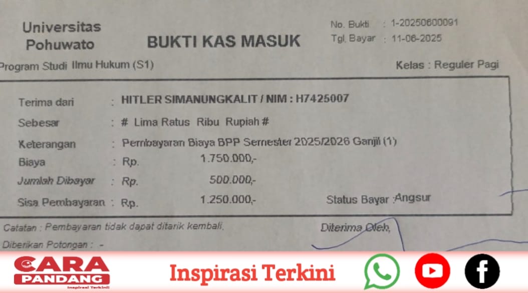 POHUWATO, CARAPANDANG - Polemik mencuat di lingkungan Akademik Universitas Pohuwato setelah beredar kabar seorang mahasiswa baru Fakultas Hukum yang sebelumnya telah membayar biaya SPP dan resmi memiliki Nomor Induk Mahasiswa (NIM), justru dipulangkan oleh pihak kampus dengan alasan yang belum jelas.