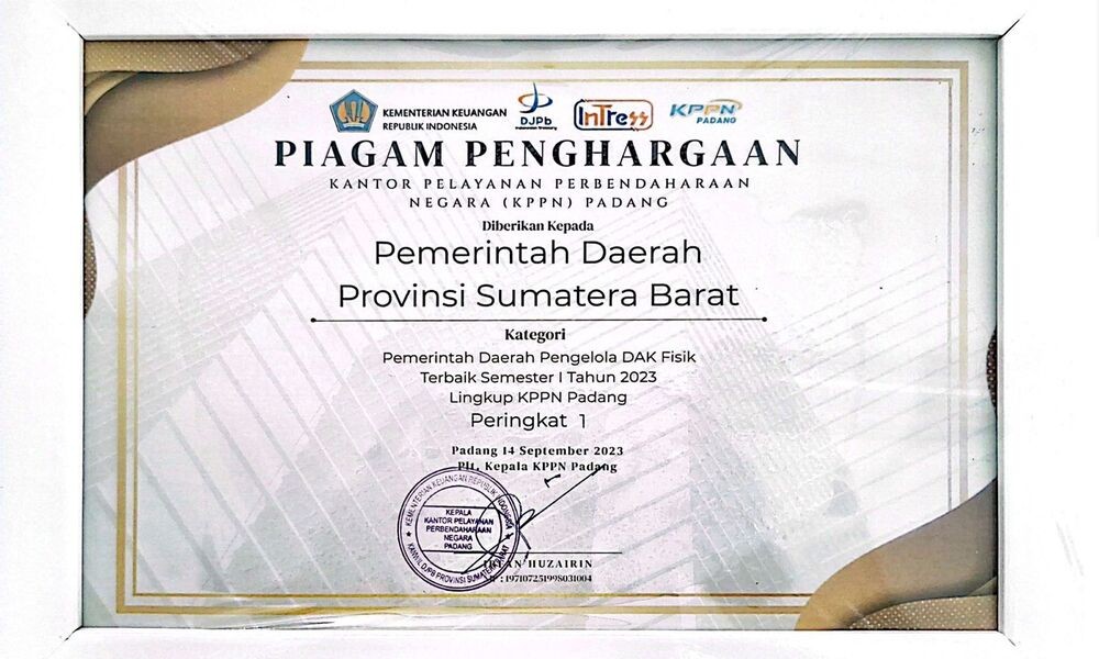 Pemerintah Provinsi Sumatera Barat (Pemprov Sumbar) meraih penghargaan sebagai Terbaik 1 dalam hal Pengelolaan Dana Alokasi Khusus (DAK) Fisik Semester I Tahun 2023 di Lingkup KPPN Padang.