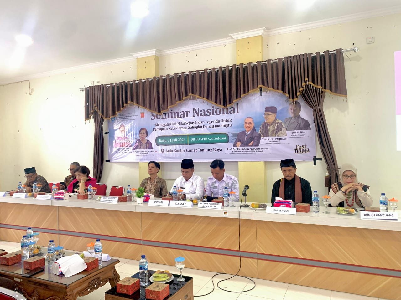 AGAM, CARAPANDANG - Seminar bertajuk "Menggali Nilai-Nilai Sejarah dan Legenda untuk Pemajuan Kebudayaan Salingka Danau Maninjau" digelar di aula kantor Camat Tanjung Raya Kabupaten Agam, Sumatera Barat, Rabu (31/7). Acara ini dihadiri oleh budayawan, Ketua LKAAM Kabupaten Agam, dan tokoh masyarakat untuk membahas dan melestarikan kekayaan budaya di sekitar Danau Maninjau tersebut.