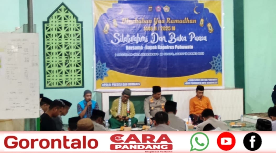 POHUWATO, CARAPANDANG - Momen penuh kebahagiaan dan kedamaian tercipta dalam acara buka bersama yang digelar oleh Kapolres Pohuwato AKBP Winarno, S.H., S.I.K., yang didampingi beberapa pejabat utama Polres Pohuwato, bersama warga masyarakat desa Sipayo kecamatan Paguat, bertempat di Masjid An'nida, Sabtu (15/03/2025).