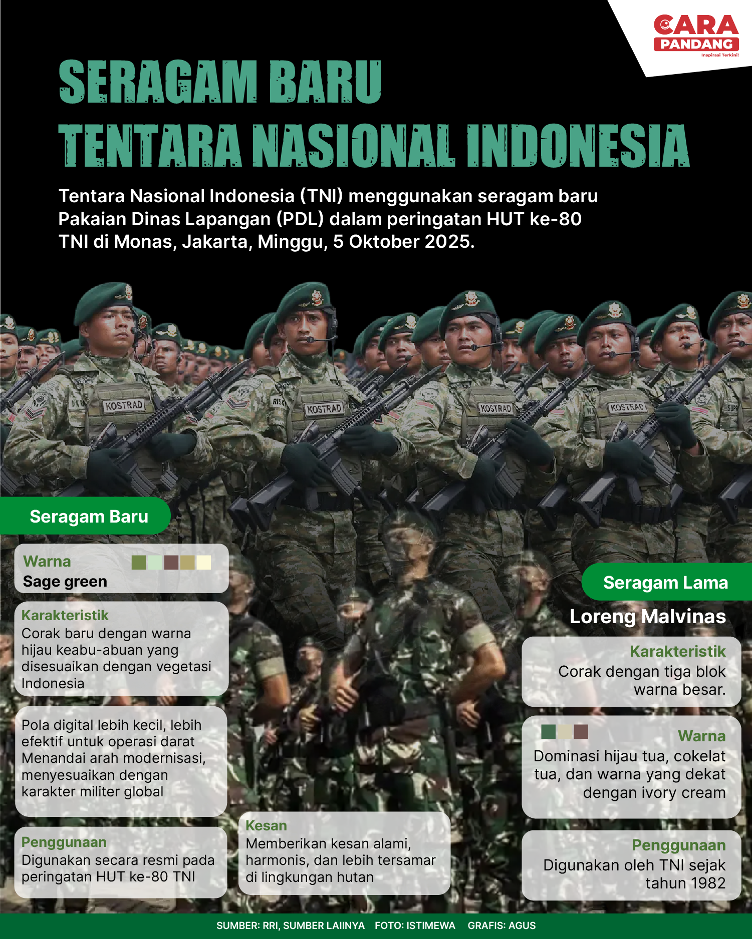 Beranda Infografis Seragam Baru TNI Infografis Seragam Baru TNI Penulis Amira Izzati - 08 Oktober 2025 10:01 0 Seragam Baru TNI Tags Berita Sebelumnya Rupiah Pada Rabu Pagi Melemah Menjadi Rp16.618 Per Dolar AS Berita Berikutnya Indonesia Dalam Dilema Misi Perdamaian Dunia LEAVE A REPLY Cancel reply Comment: Please enter your comment! Name:* Please enter your name here Email:* You have entered an incorrect email address! Please enter your email address here Website: Save my name, email, and website in this browser for the next time I comment. Berita Teratas Kisah Ajaib Nabi Sulaiman dan Anak yang Berbakti kepada Orang Tua 8 Cara Merawat Kucing Kesayangan Agar Tubuhnya Selalu Sehat Minuman yang Mampu Redakan Batuk yang Menganggu Manfaat Ajaib Bawang Putih Bagi Kesehatan 8 Cara Menjaga Kesehatan Gigi dan Mulut yang Efektif Berita Terkait Berita Terkait Wajah Baru PP Tunas: Garda Terdepan Perlindungan Anak Indonesia Zoel Rachman - 31 Maret 2026 09:42 MBG 5 Hari Sepekan Masih Wacana Maliq - 30 Maret 2026 11:49 Presiden Ingin Semua Kendaraan Dikonversi ke Listrik Maliq - 30 Maret 2026 11:48 Kewaijiban PSE Terhadap Pengguna Anak Maliq - 30 Maret 2026 11:15