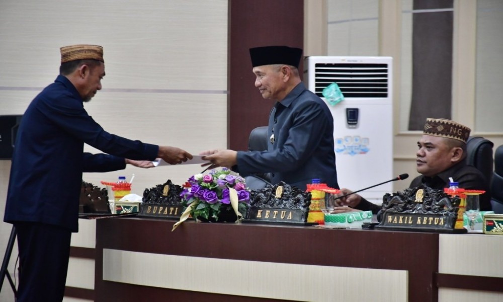 POHUWATO, CARAPANDANG.COM - Bupati Pohuwato, Saipul A. Mbuinga memberikan apresiasi dan penghargaan yang setinggi-tingginya atas pandangan dan saran yang disampaikan DPRD Pohuwato melalui pemandangan umum fraksi-fraksi pada penyerahan dokumen ranperda Perubahan APBD Kabupaten Pohuwato tahun anggaran 2023 di ruang sidang DPRD Pohuwato, Rabu, (6/9/2023).
