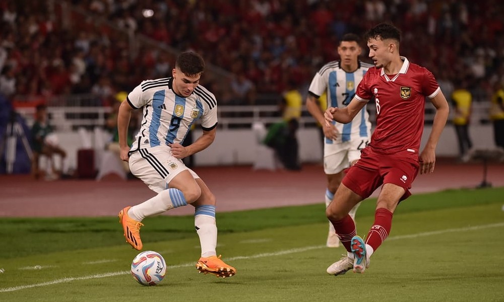 Asnawi Mangkualam, Shayne Pattynama, dan Pratama Arhan yang berada di kedua sisi sayap Timnas Indonesia juga berjibaku menghalau setiap upaya serangan yang dilakukan Julian Alvarez dkk.