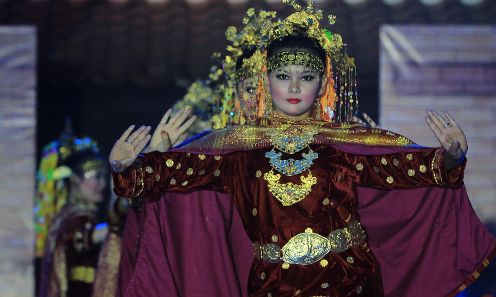 CARAPANDANG - Empat orang perempuan keluar panggung, mereka mengenakan baju adat Lahat berwara merah marun. Pada bagian bahunya terdapat kain songket yang menyerupai sayap. Sementara bagian kepala dihias dengan berbagai hiasan, seperti cempako, ayun-ayun, pilis, dan teratai. Mereka akan menarikan sebuah tari tradisional Lahat yang bernama tari gegerit.