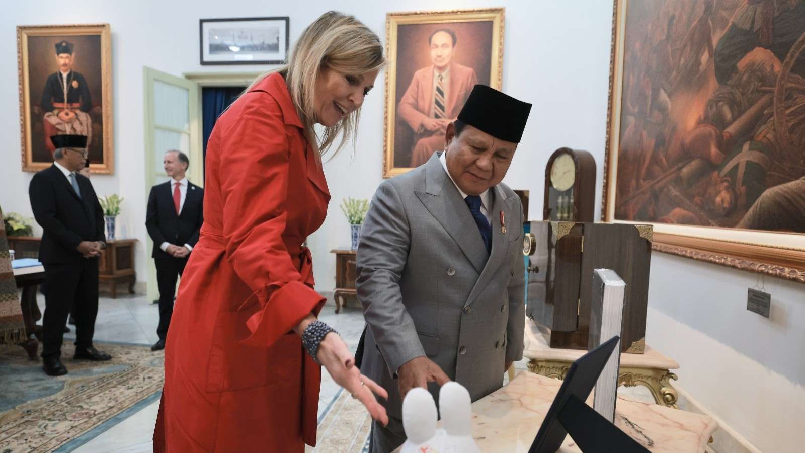 CARAPANDANG.COM- Suasana hangat terlihat ketika Presiden Republik Indonesia Prabowo Subianto bertukar cendera mata dengan Ratu Máxima usai pertemuan bilateral di Istana Negara, Jakarta, Kamis, menjadi simbol persahabatan sekaligus apresiasi budaya antara Indonesia dan Belanda.