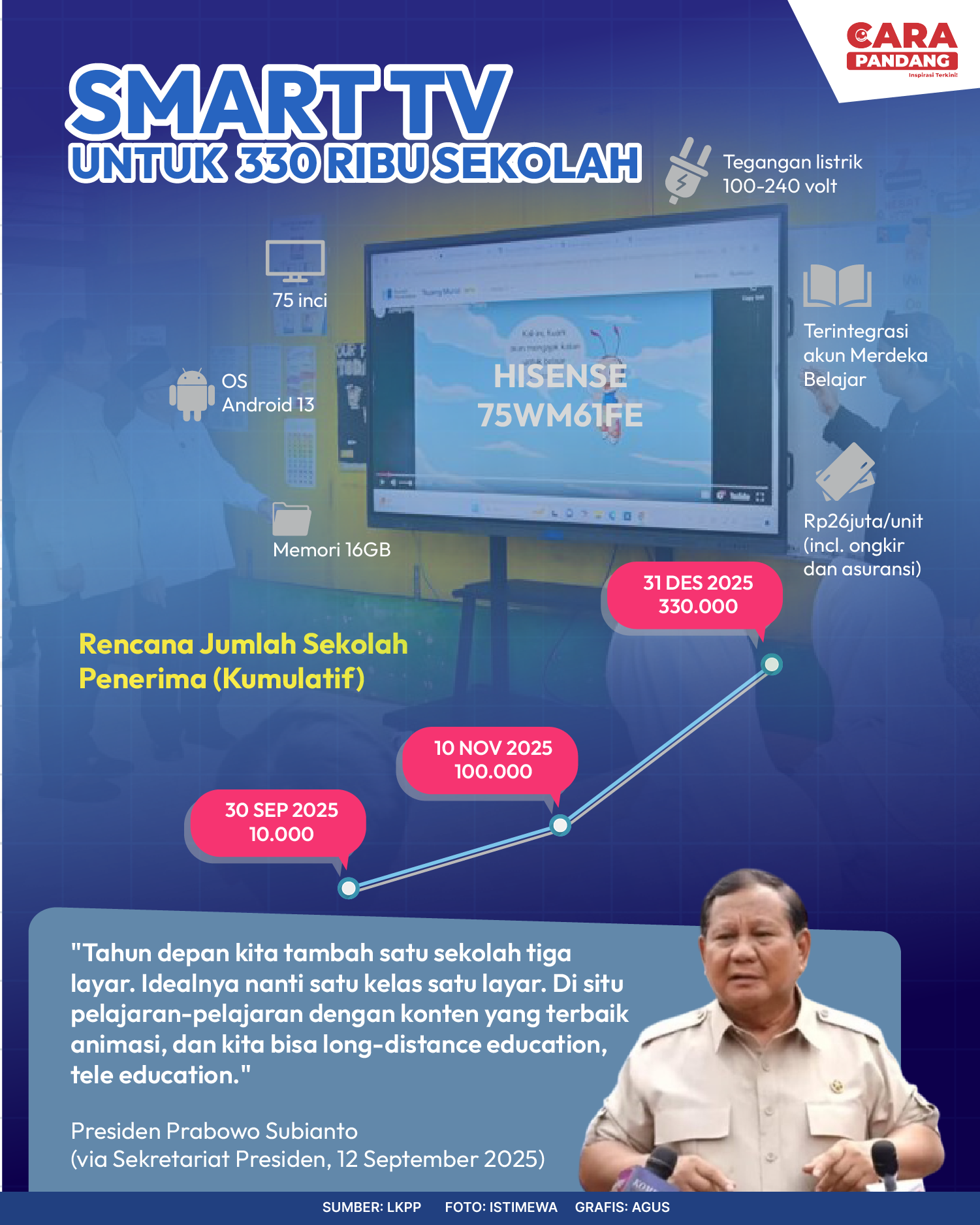 Beranda Infografis SmartTV untuk 330 Ribu Sekolah Infografis SmartTV untuk 330 Ribu Sekolah Penulis Amira Izzati - 03 Oktober 2025 08:08 0 SmartTV untuk 330 Ribu Sekolah Tags Berita Sebelumnya Prabowo Hadiri Presidential Inspection di KRI dr. Radjiman Wedyodiningrat (RJW-992) Berita Berikutnya Indonesia Dalam Dilema Misi Perdamaian Dunia LEAVE A REPLY Cancel reply Comment: Please enter your comment! Name:* Please enter your name here Email:* You have entered an incorrect email address! Please enter your email address here Website: Save my name, email, and website in this browser for the next time I comment. Berita Teratas Kisah Ajaib Nabi Sulaiman dan Anak yang Berbakti kepada Orang Tua 8 Cara Merawat Kucing Kesayangan Agar Tubuhnya Selalu Sehat Minuman yang Mampu Redakan Batuk yang Menganggu Manfaat Ajaib Bawang Putih Bagi Kesehatan 8 Cara Menjaga Kesehatan Gigi dan Mulut yang Efektif Berita Terkait Berita Terkait Wajah Baru PP Tunas: Garda Terdepan Perlindungan Anak Indonesia Zoel Rachman - 31 Maret 2026 09:42 MBG 5 Hari Sepekan Masih Wacana Maliq - 30 Maret 2026 11:49 Presiden Ingin Semua Kendaraan Dikonversi ke Listrik Maliq - 30 Maret 2026 11:48 Kewaijiban PSE Terhadap Pengguna Anak Maliq - 30 Maret 2026 11:15