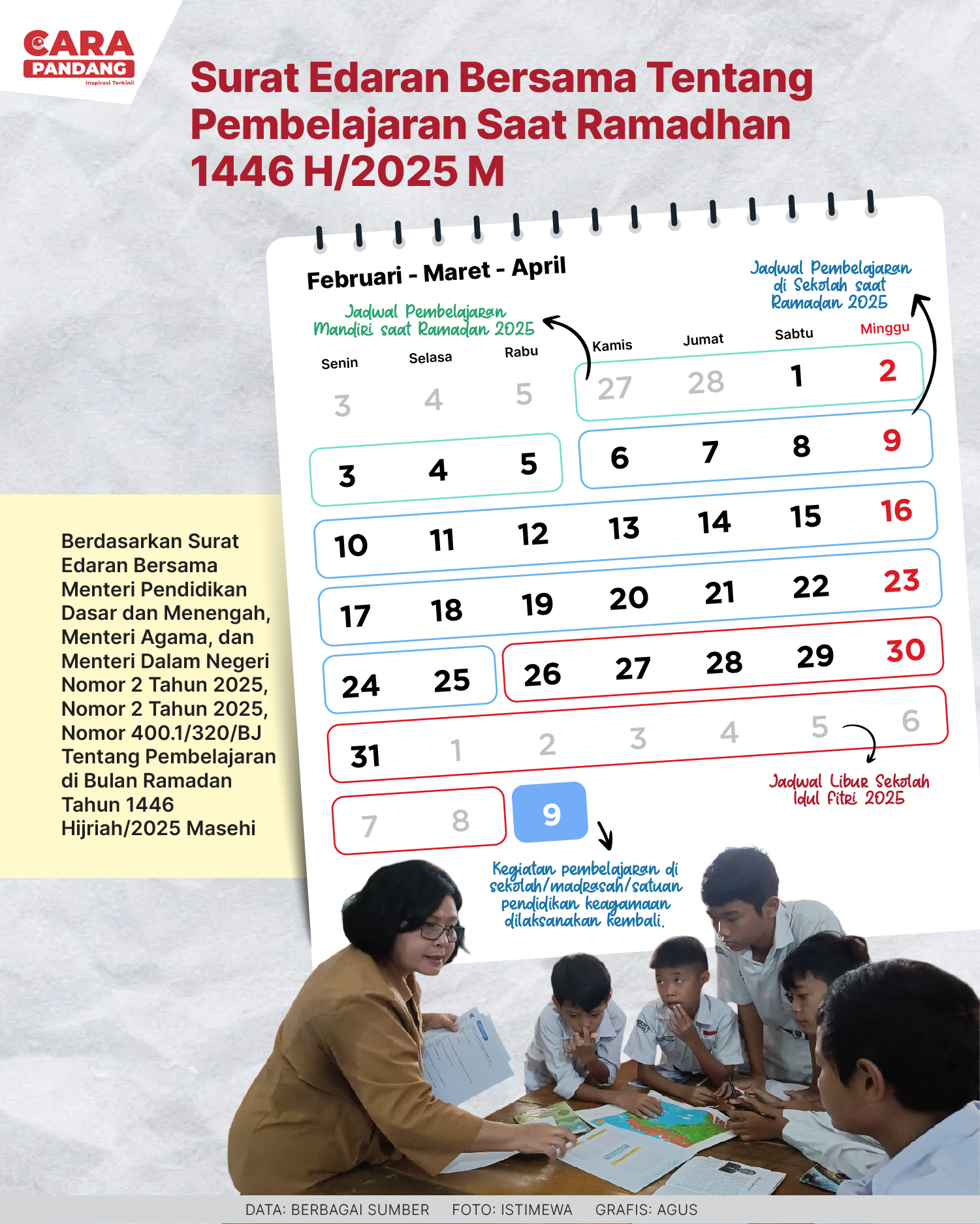 CARAPANDANG - Pemerintah resmi menerbitkan Surat Edaran Bersama (SEB) Menteri Pendidikan Dasar dan Menengah, Menteri Agama, dan Menteri Dalam Negeri yang mengatur perihal pembelajaran saat bulan Ramadan 2025 pada Selasa (21/1/2025).